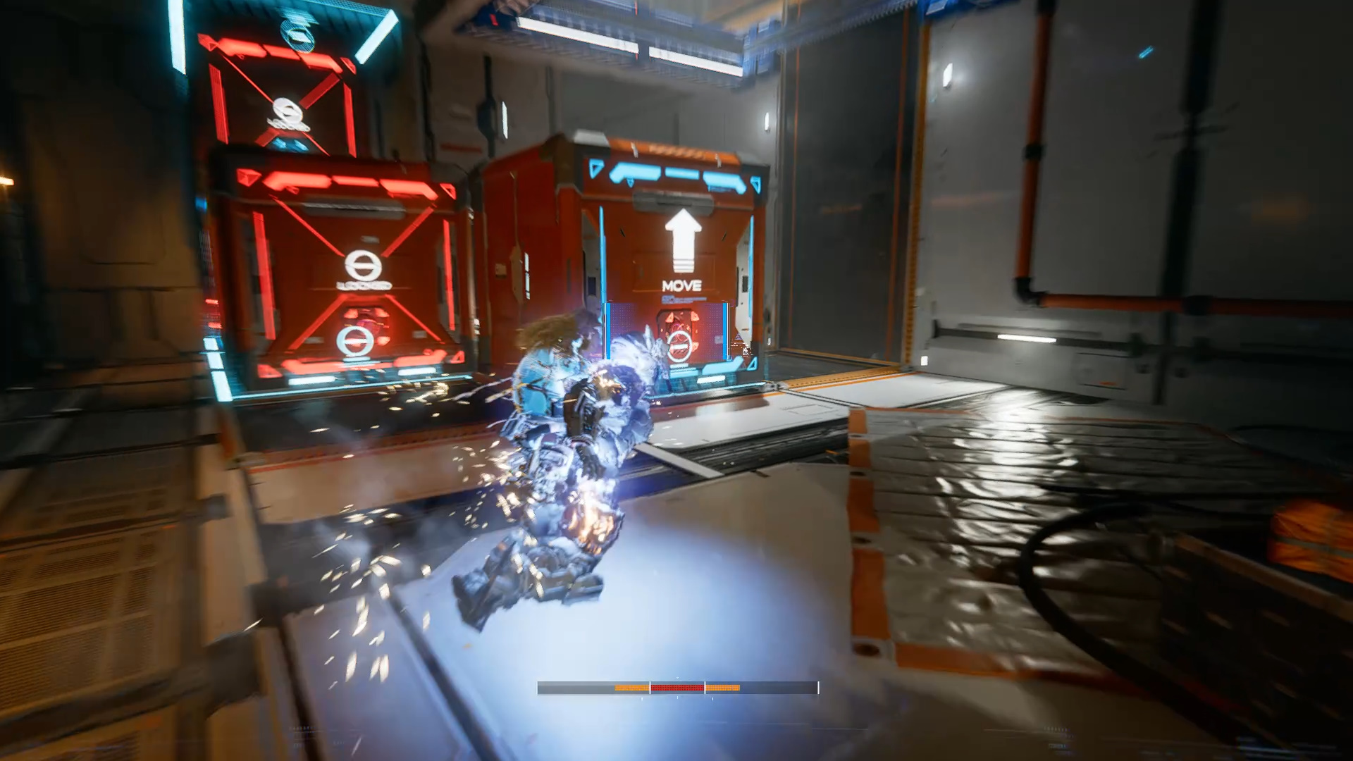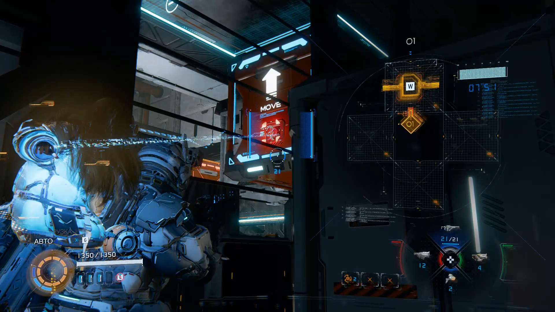 Вернитесь назад и толкните влево второй контейнер, чтобы пройти дальше. Победите всех врагов, обратите внимание на несколько передвижных контейнеров. Сначала взломайте красный узел на потолке, чтобы открыть люк. В него-то вам и нужно забраться. Обойдите эти контейнеры и через решетку толкните нижний дальний. Вернитесь влево, толкните первый контейнер, с которым можно взаимодействовать, перейдите вправо и толкните контейнер слева от решетки (забора). То есть всего по одному передвижению трех разных контейнеров.