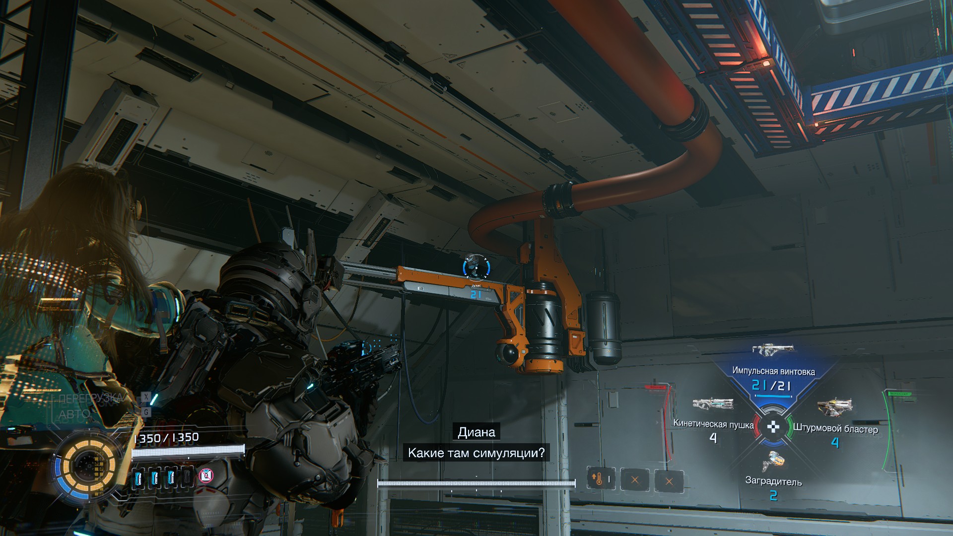 Сначала спрыгните вниз (не прыгайте на другую сторону по платформам, как на то намекает Хью), заберитесь на выступ справа и сломайте лув, чтобы найти синий контейнер с модификацией «Самообладание». Поднимитесь обратно на возвышенность и прыгайте поверху на другую сторону. В углу на платформе справа, за оранжевой трубой, спрятан компонент для улучшения.