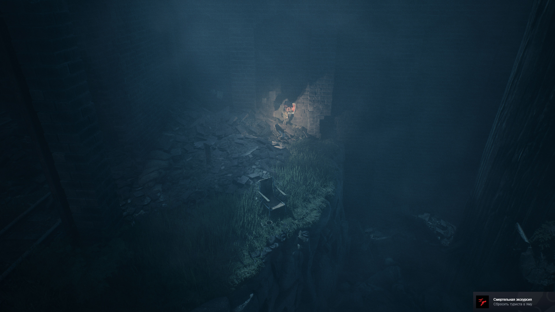 Оказавшись снаружи, поднимитесь по ближайшей лестнице. Вы увидите высокого мужчину с чемоданом, который скроется в переулке (это Нюхач). Прежде чем идти следом за ним, перейдите через два набора железнодорожных путей вглубь экрана. На краю обрыва есть два лежака: сбейте тот, на котором находится тело с мешком на голове, чтобы открыть достижение «Смертельная экскурсия».