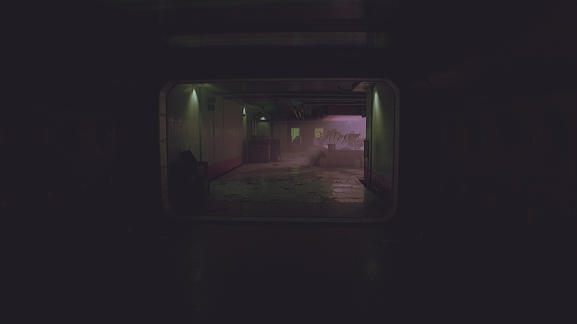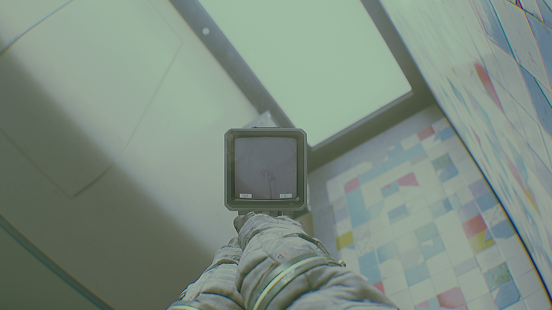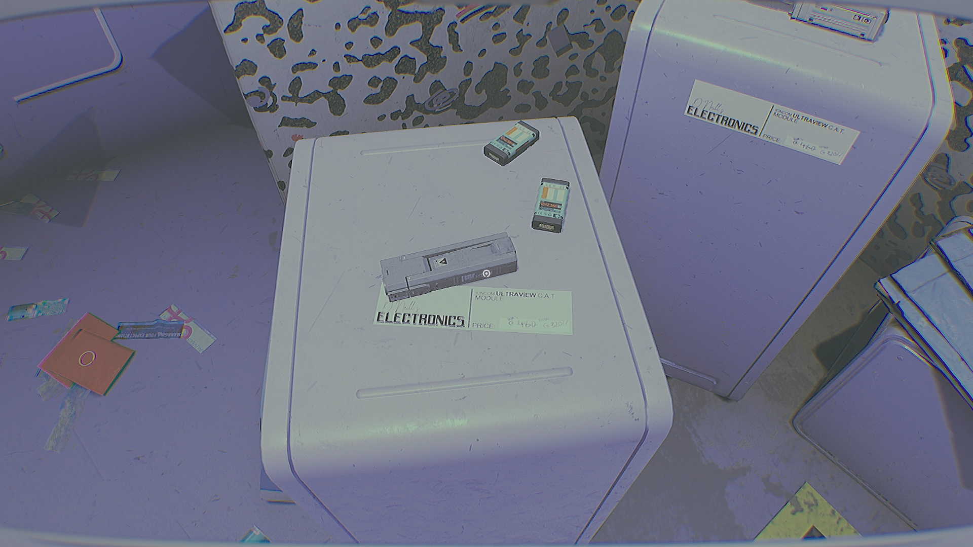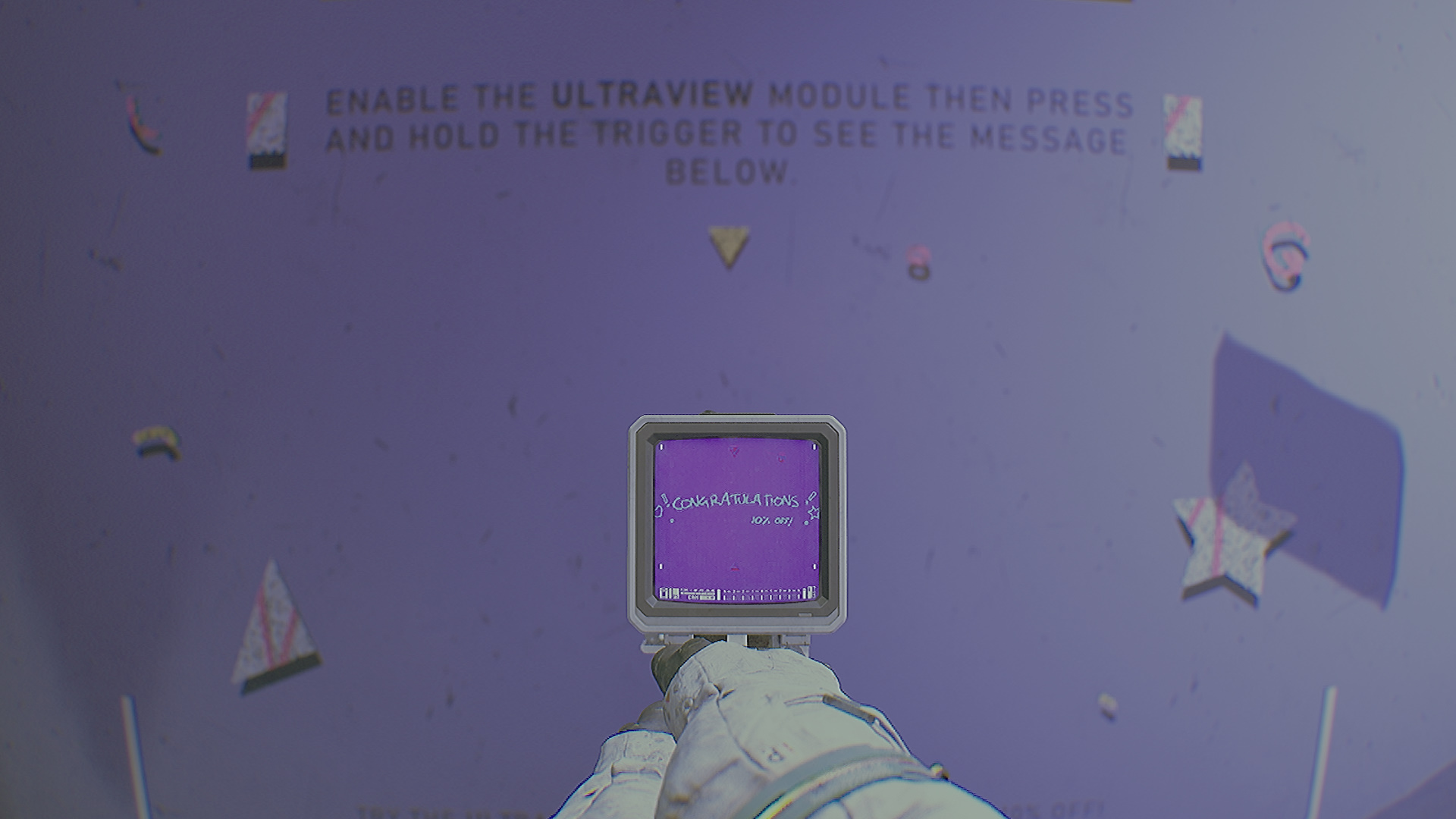 Теперь у вас есть два режима ИПК. Если слот модуля сбоку открыт, значит используется «Смотритель». Удерживая ПКМ, зажмите ЛКМ. Вы будете подсвечивать область ультрафиолетом или фонариком. Наведите ультрафиолет на фиолетовую стену, чтобы увидеть, как работает устройство. Попытайтесь выйти из магазина, дверь захлопнется.
