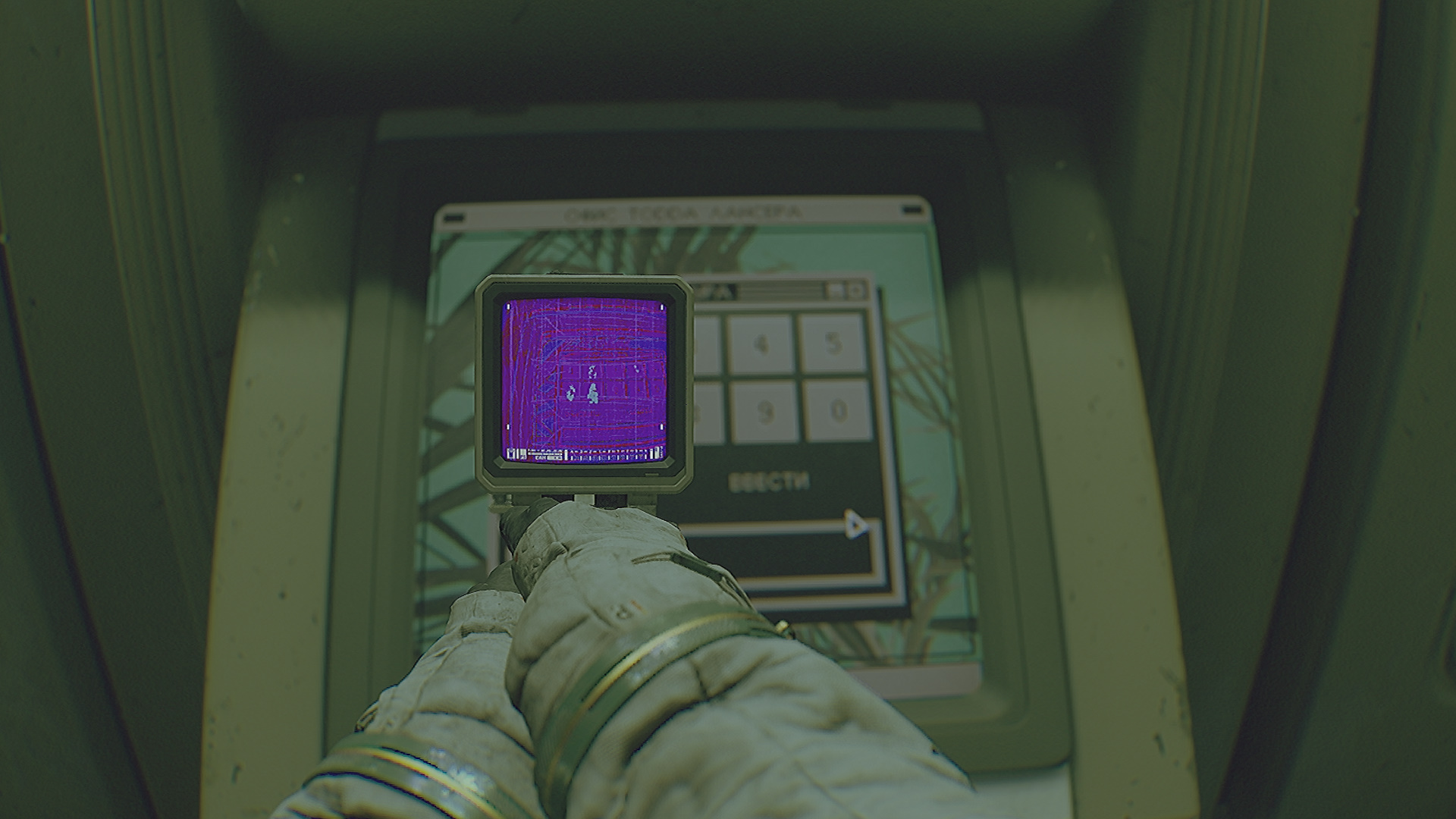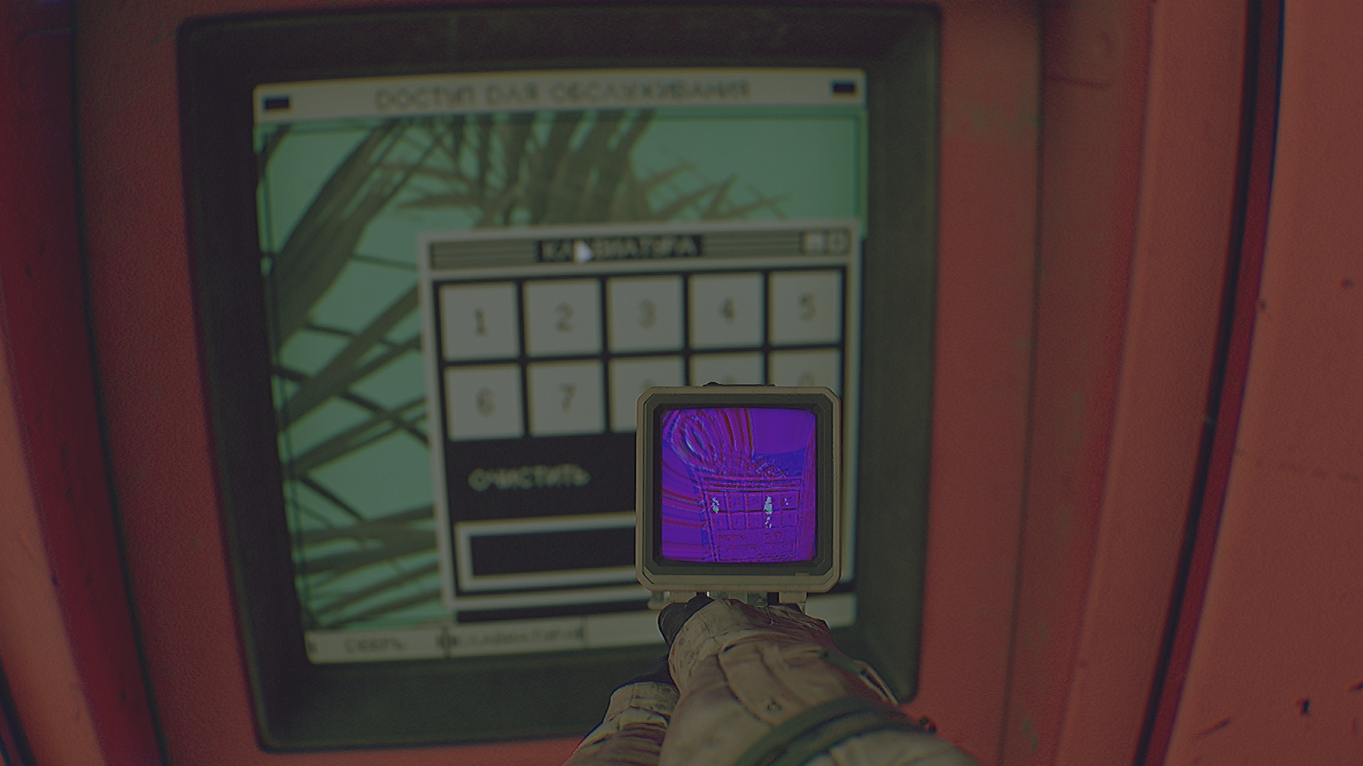 Перейдите на вкладку с клавиатурой. Эту вкладку можно перемещать. Подсветите на экран ультрафиолетом и увидите отпечатки. Далее нужно переместить вкладку с клавиатурой так, чтобы все отпечатки указывали на клавиши. Затем составьте код, двигаясь от большего отпечатка к меньшему. Введите и пройдите в закрытую комнату с оборудованием.