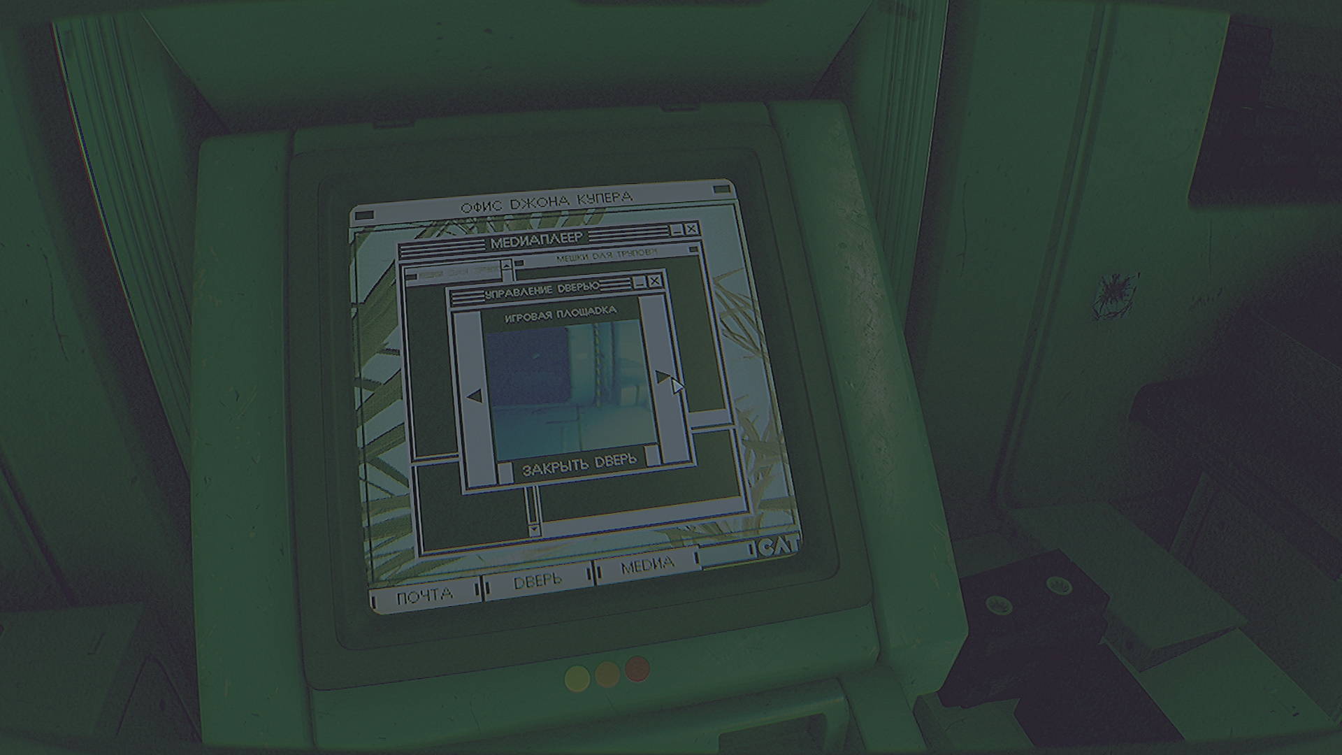 Дверь откроется. Войдите в комнату Джона, прослушайте запись с диктофона справа. Осмотрите терминал, можете прочесть сообщения на почте, просмотреть видеоролик в разделе «Медиа». Нажмите на раздел «Дверь». Дверь выхода из торгового комплекса открыть не получится. Но вы можете открыть дверь игровой площадки.