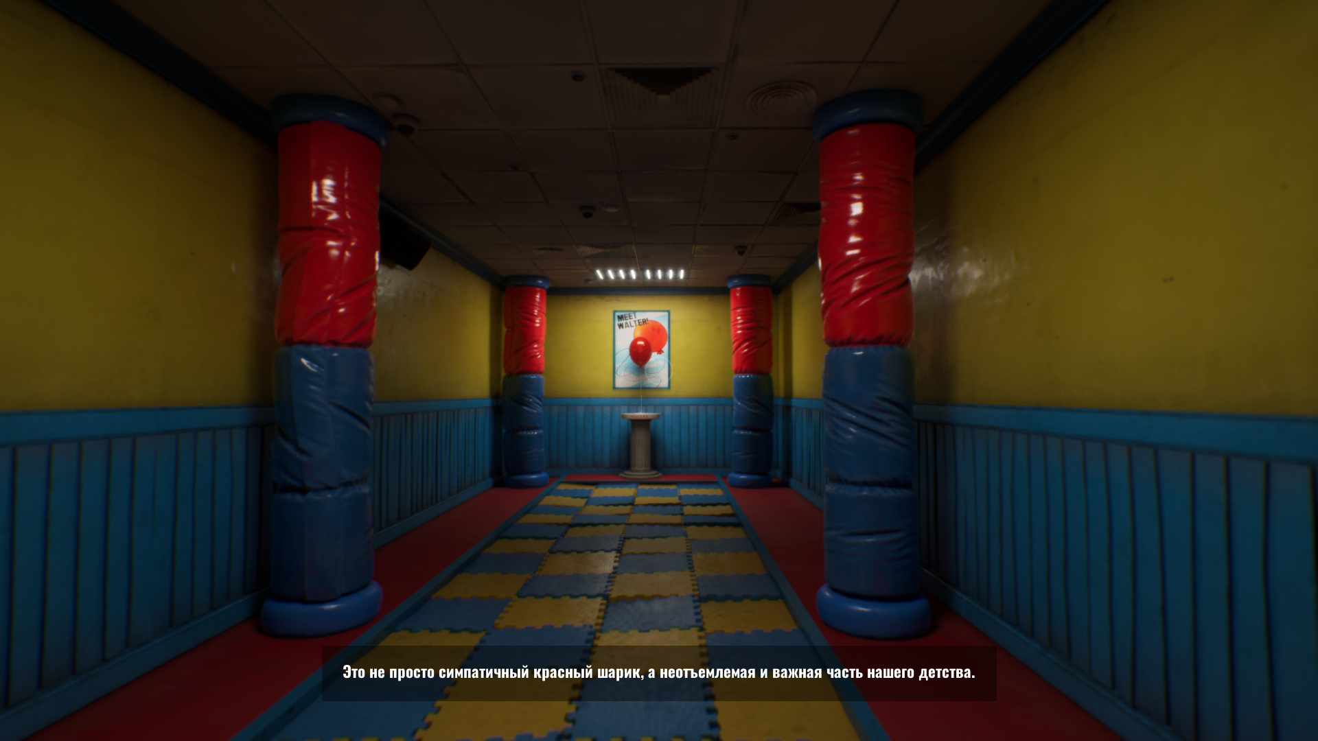 Двигайтесь по разноцветным коридорам. Войдите в комнату слева и идите к воздушному шарику Вальтеру. Пол будет работать как конвейер, но, когда рассказчик замолчит, вы сможете приблизиться и взять шарик.
