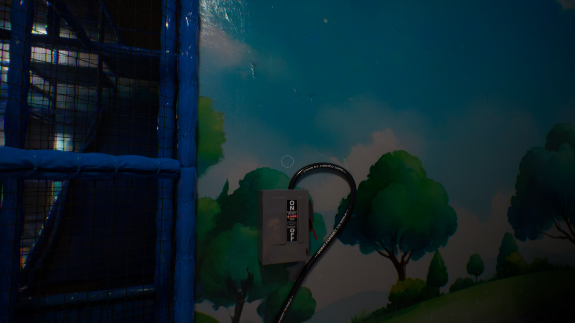 На входе в игровую вы повысите счетчик радости до 3/8 делений. Пройдите дальше, пока не обнаружите телевизор. На нем показано, что нужно активировать 4 генератора. Фактически вы должны отыскать 4 настенных щитка и опустить красные рычаги.
