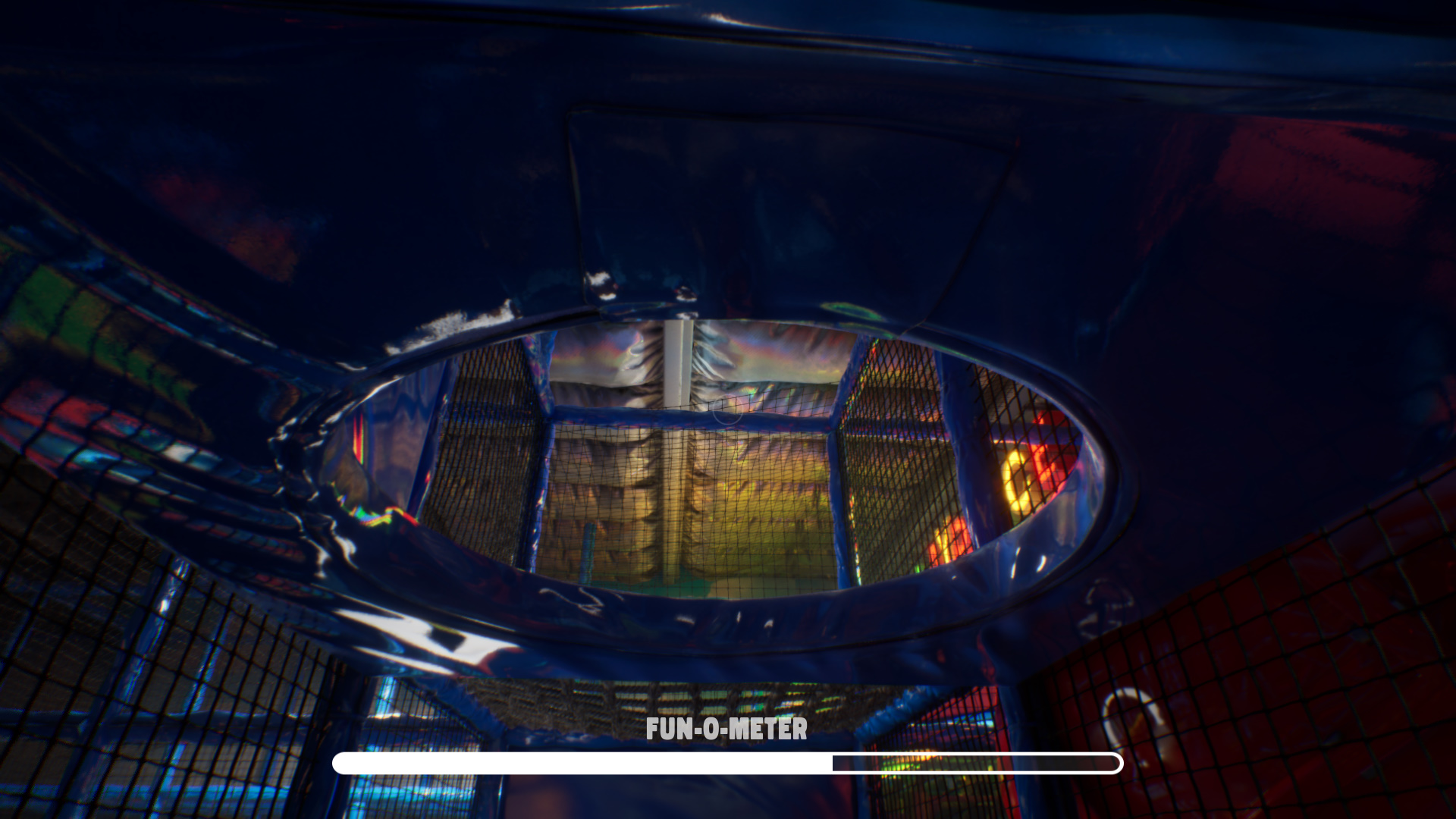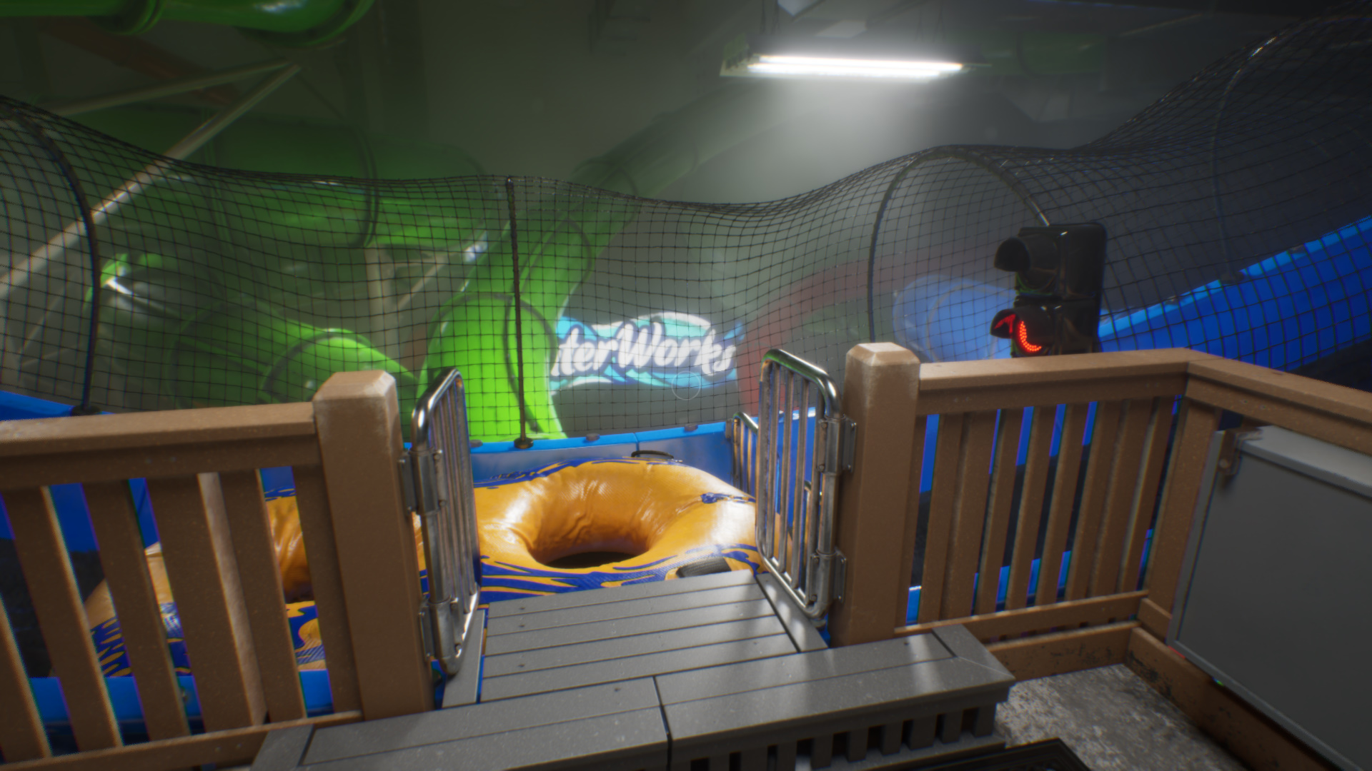 Идите влево, поднимитесь наверх, взвесьтесь и нажмите на зеленую кнопку. Садитесь в надувной круг, чтобы прокатиться на горках.