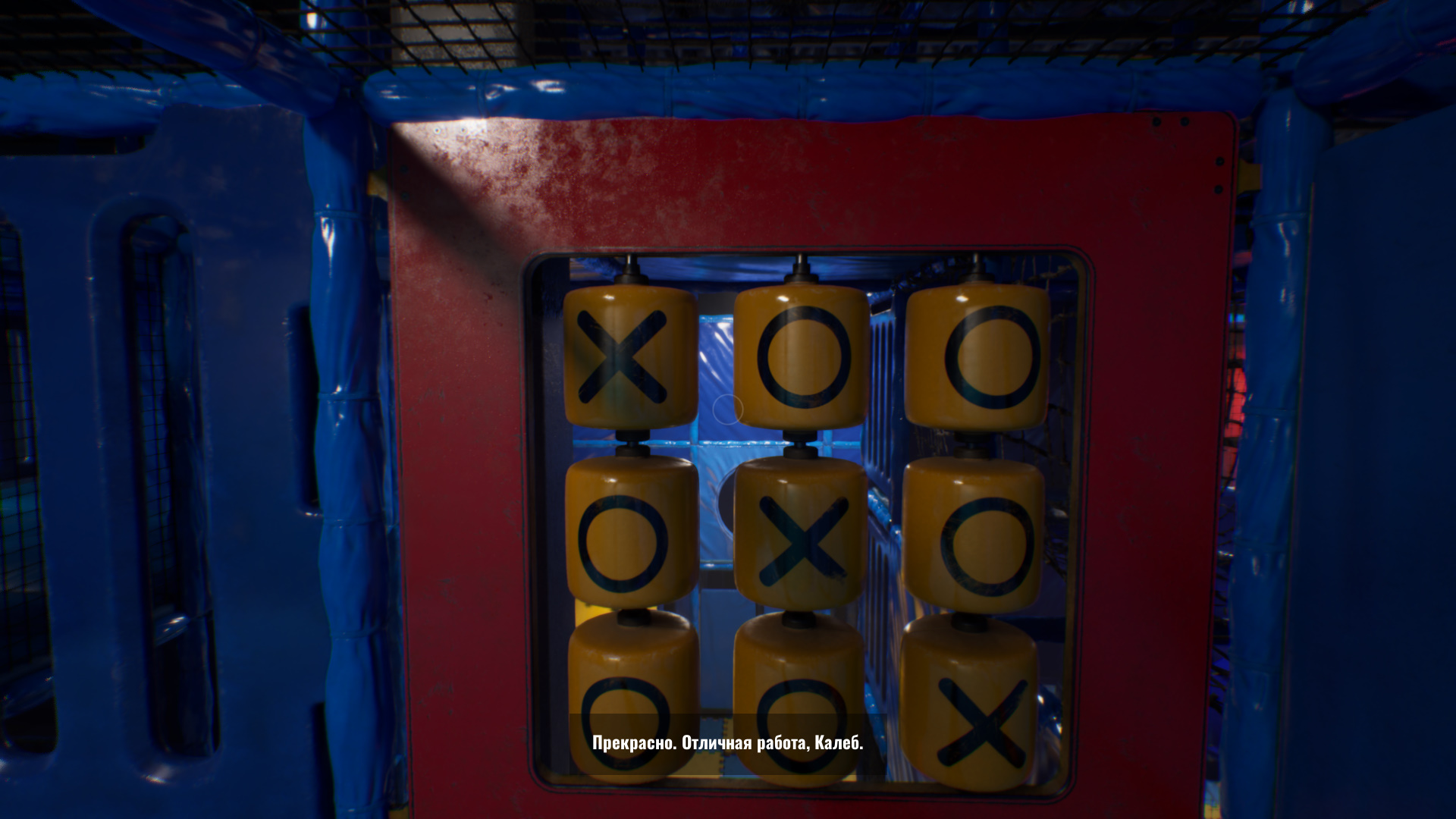 Эти щитки хоть и разбросаны в разных частях игрового зала, но найти их можно по черным кабелям, которые выходит из телевизора. Как только активируете все четыре, обратите внимание на игру «крестики-нолики» около самого дальнего щитка. Выставьте по диагонали, начиная с левого верхнего угла и заканчивая правым нижним, крестики.