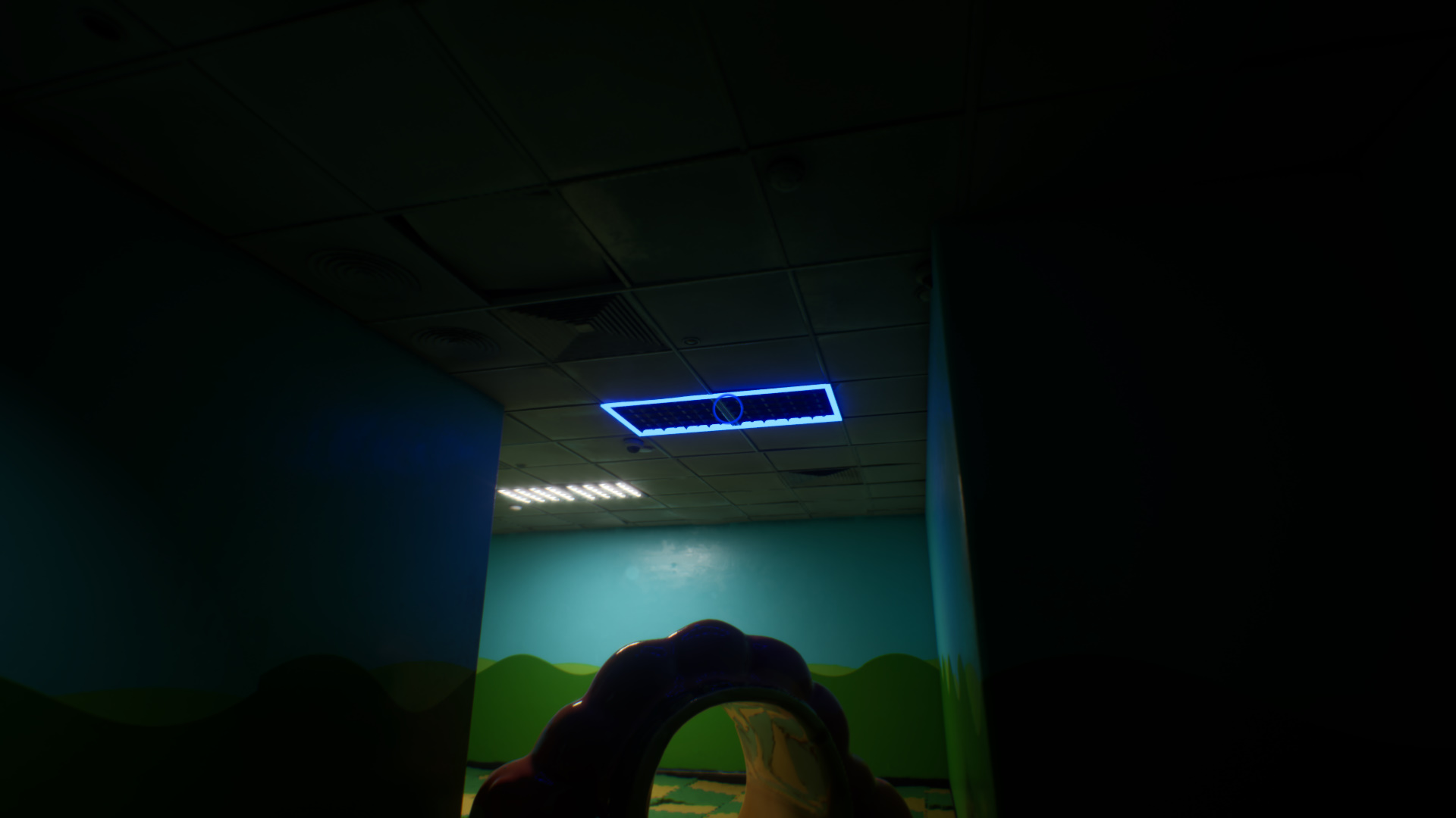 Выйдите и примените свет на потолочную лампу у двери DEEP STORAGE. Рассказчик попросит туда не ходить. Вновь заберите свет из этой лампы, идите к выходу и зарядите лампу сверху.
