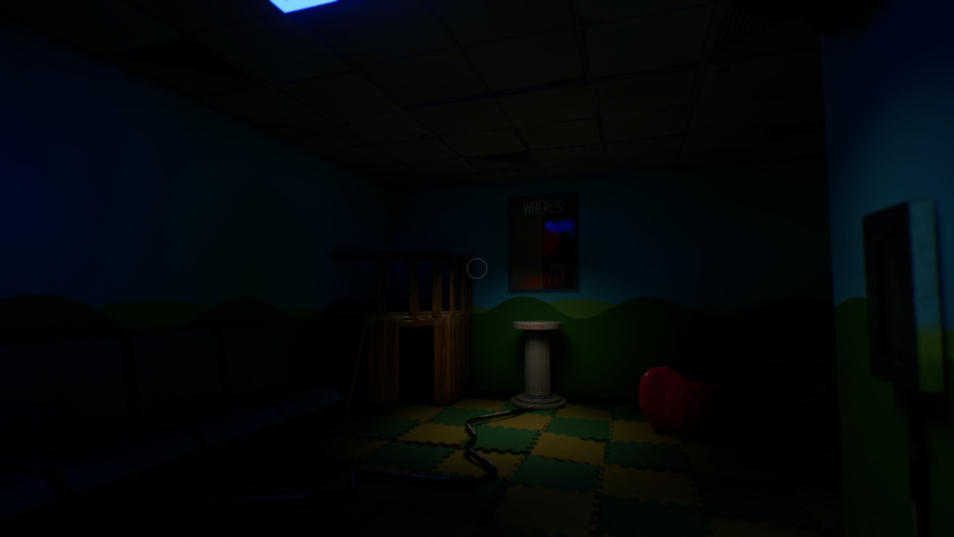 Выйдите из комнаты, притяните свет из лампы сверху и двигайтесь в конец коридора. Пройдите в игровую, сверните влево и увидите закрытую дверь. Вверху есть светильник. Отправьте на него свет, войдите в помещение и посмотрите влево. Увидите постамент для Вальтера. Оставьте на нем шарик.