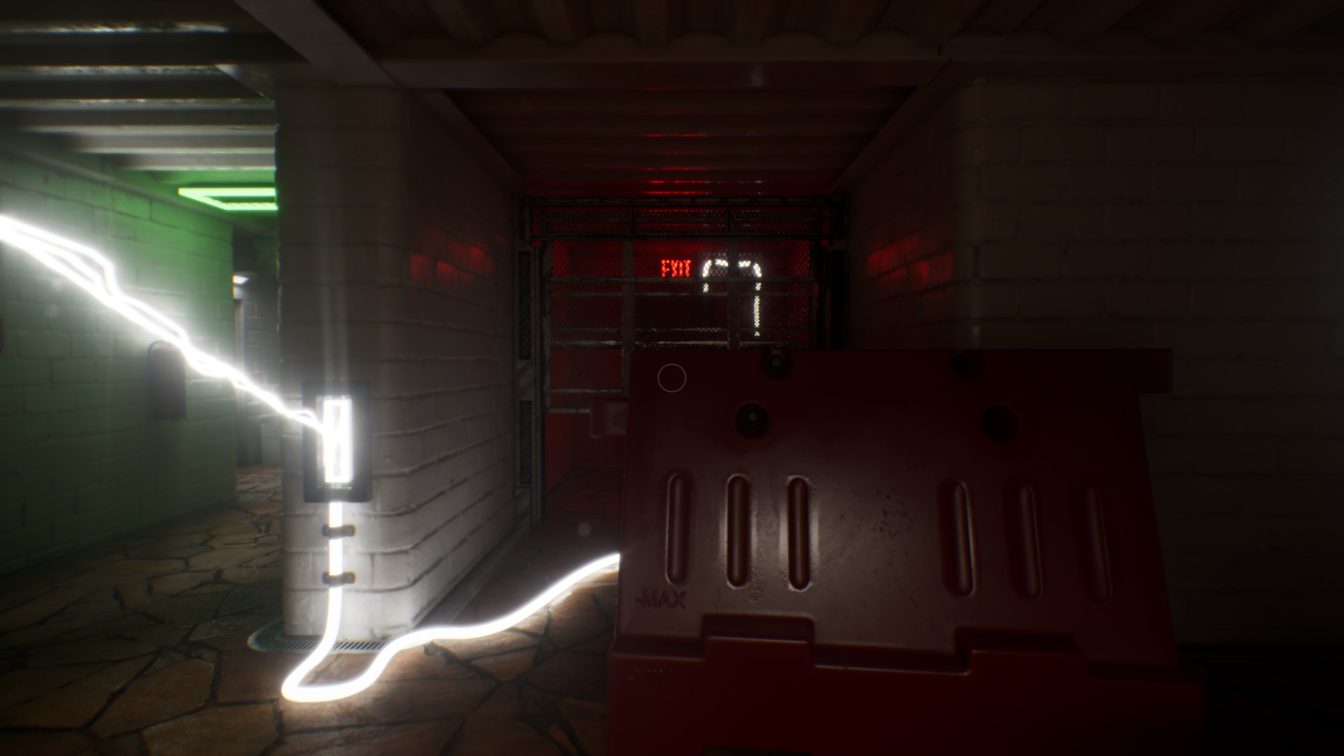 Вам нужно открыть дверь с красной табличкой EXIT за решеткой. Справа и слева от прохода к решетке есть два приемника (как у тех дверей, которые вы недавно открывали светом). Разместите один красный барьер перед правым приемником, а после подайте свет на лампу над дверью, через которую вы сюда пришли (напротив решетке и двери с красной табличкой EXIT). В итоге свет попадет на левое отверстие, и дверь за решеткой откроется.