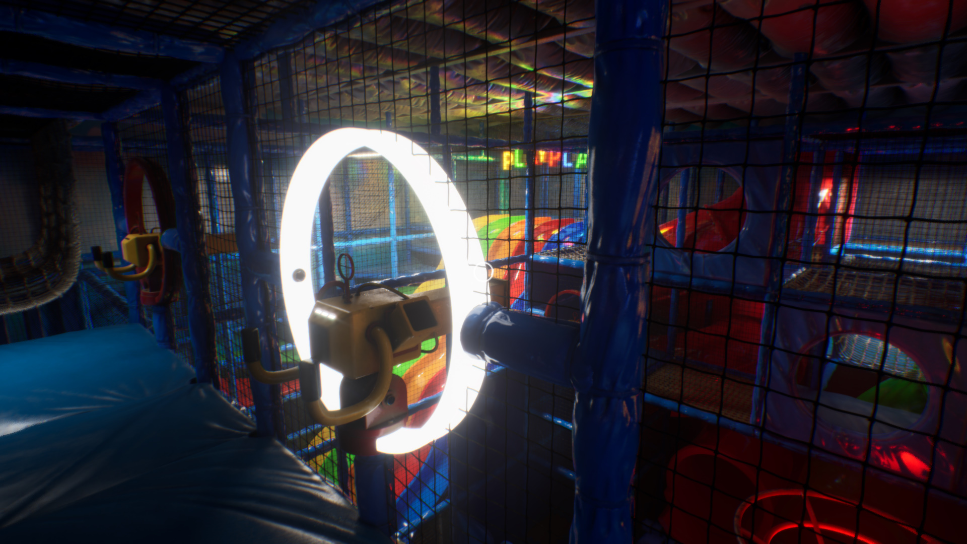 - Наконец, встав в комнате с постаментом, Вальтером, развернитесь и притяните свет от лампы, которую использовали, чтобы сюда попасть. Синяя дверь за вами закроется. Подайте свет на лампу у решетки слева (чуть дальше Вальтера), проберитесь под решетку и верните свет назад. Решетка закроется, так надо. Проберитесь через трубу и подайте свет на синюю лампу. Быстро пробегите через открывшуюся дверь, заберите свет с этой синей лампой и подайте на синюю лампу над вами, в центре знакомого помещения. Быстро бегите назад, чтобы пройти через открывшуюся дверь Play Palace.