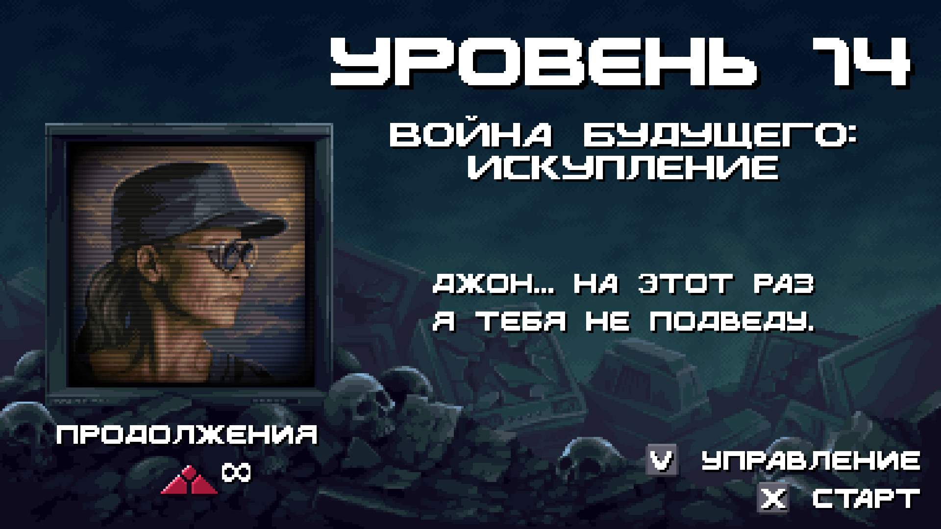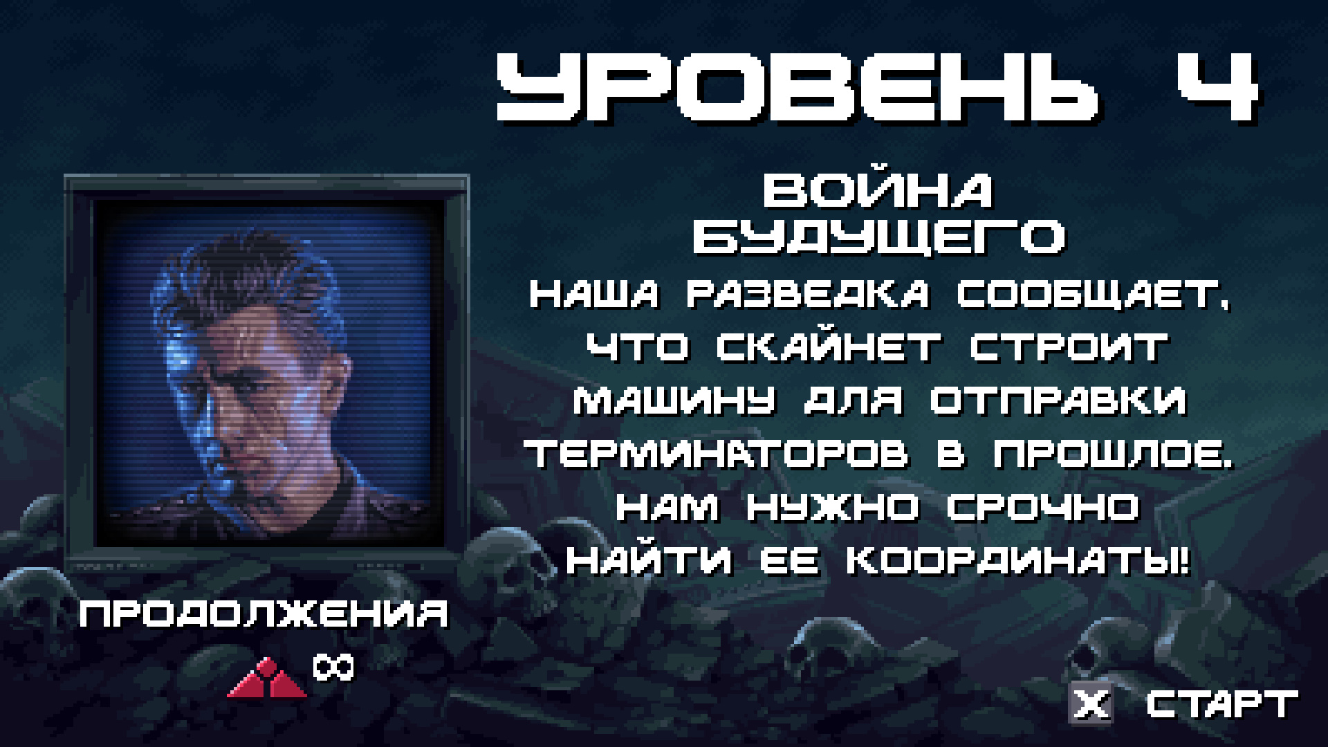 Теперь вы будете играть за Джона Коннора в будущем. У него есть две особенности: гранаты, которые вы можете бросать на клавишу V и подбирать в виде ящиков, а также различные виды оружия как у героев CONTRA. Ищите «таблетки» с разными буквами и подбирайте их, чтобы получать более мощное оружие, но на ограниченное время 20-30 секунд.