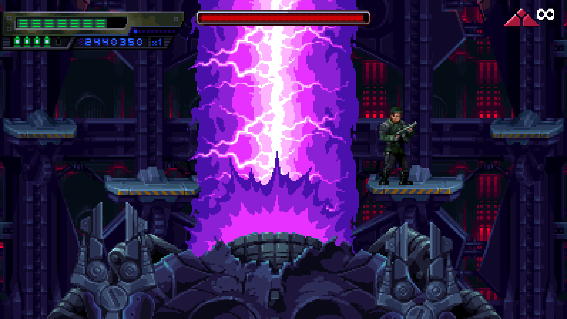 Ближе к концу уровня начнется битва с боссом. Победить его придется дважды. Избегайте красных точек, куда враг будет бить своими клешнями. По клешням можно стрелять, и при нанесении достаточного урона вы даже сможете их уничтожить. Когда босс пускает по полу ударную волну, перепрыгивайте ее или совершайте перекаты.