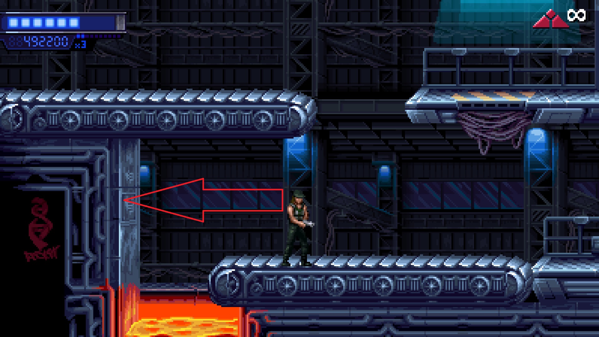 Двигайтесь дальше. Чуть выше появятся первые трубы, из которых идет огонь. Прыгайте над ними и выше и правее третьей трубы (где находится лестница вверх) стреляйте в стену с символом «Скайнет». За этой стеной спрятан секрет — продолжение СКАЙНЕТ (3/12).