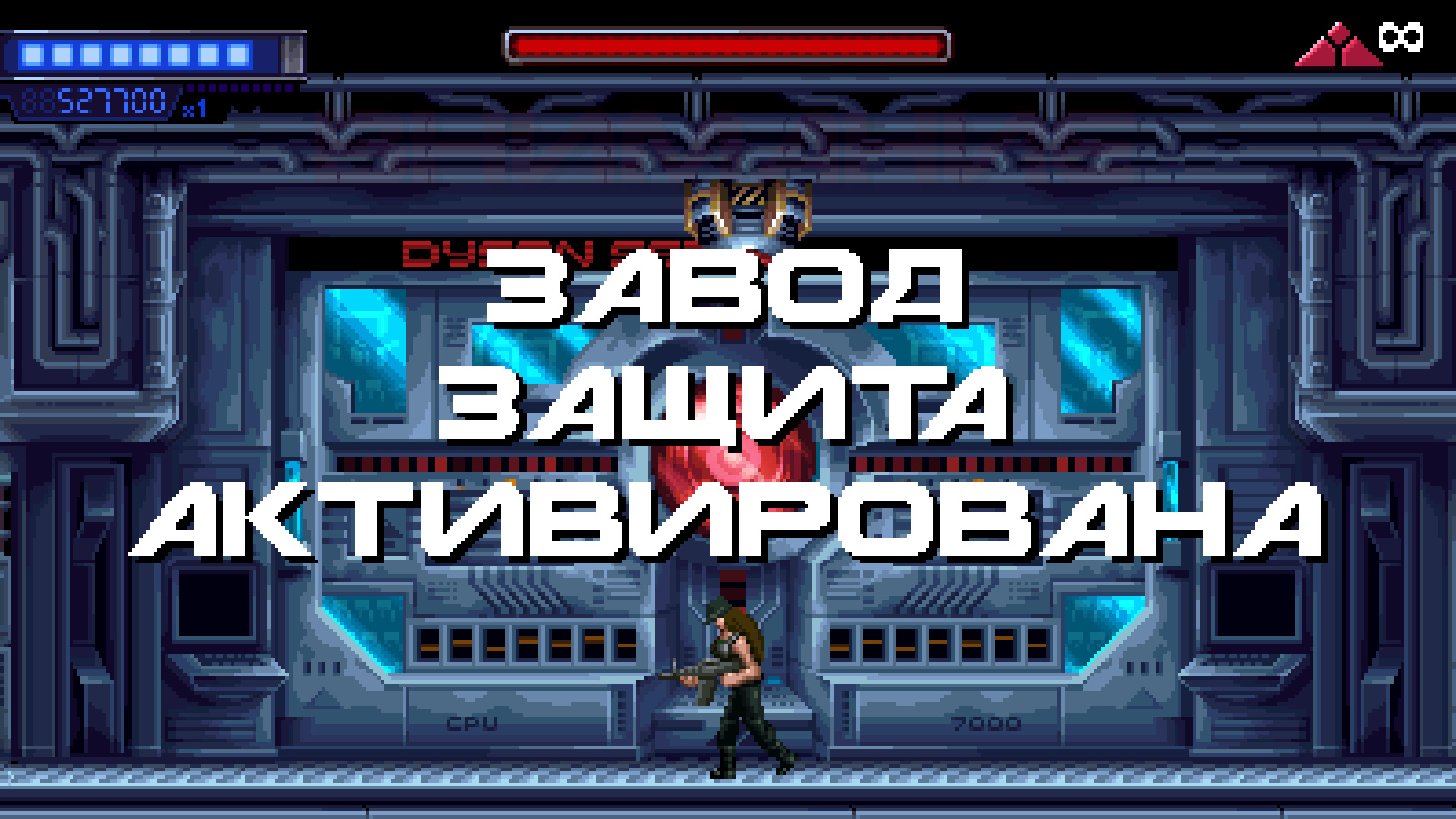 На втором этапе нужно подпрыгивать, удерживать «вниз» и стрелять. Также если остались гранаты, потратьте их прямо сейчас. В некоторые моменты на платформах появляются клешни, но далеко не всегда по ним удобно стрелять. После победы во второй раз вы увидите концовку игры.