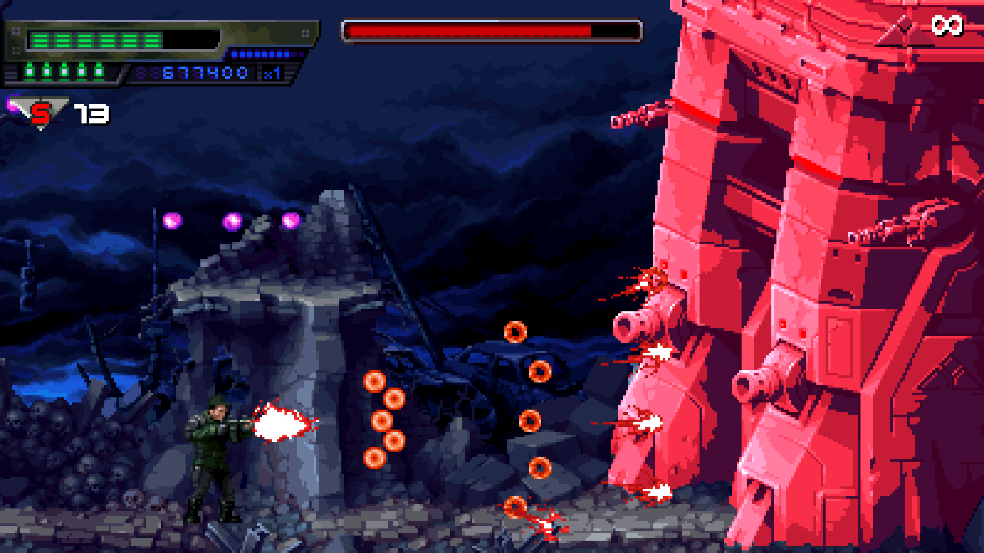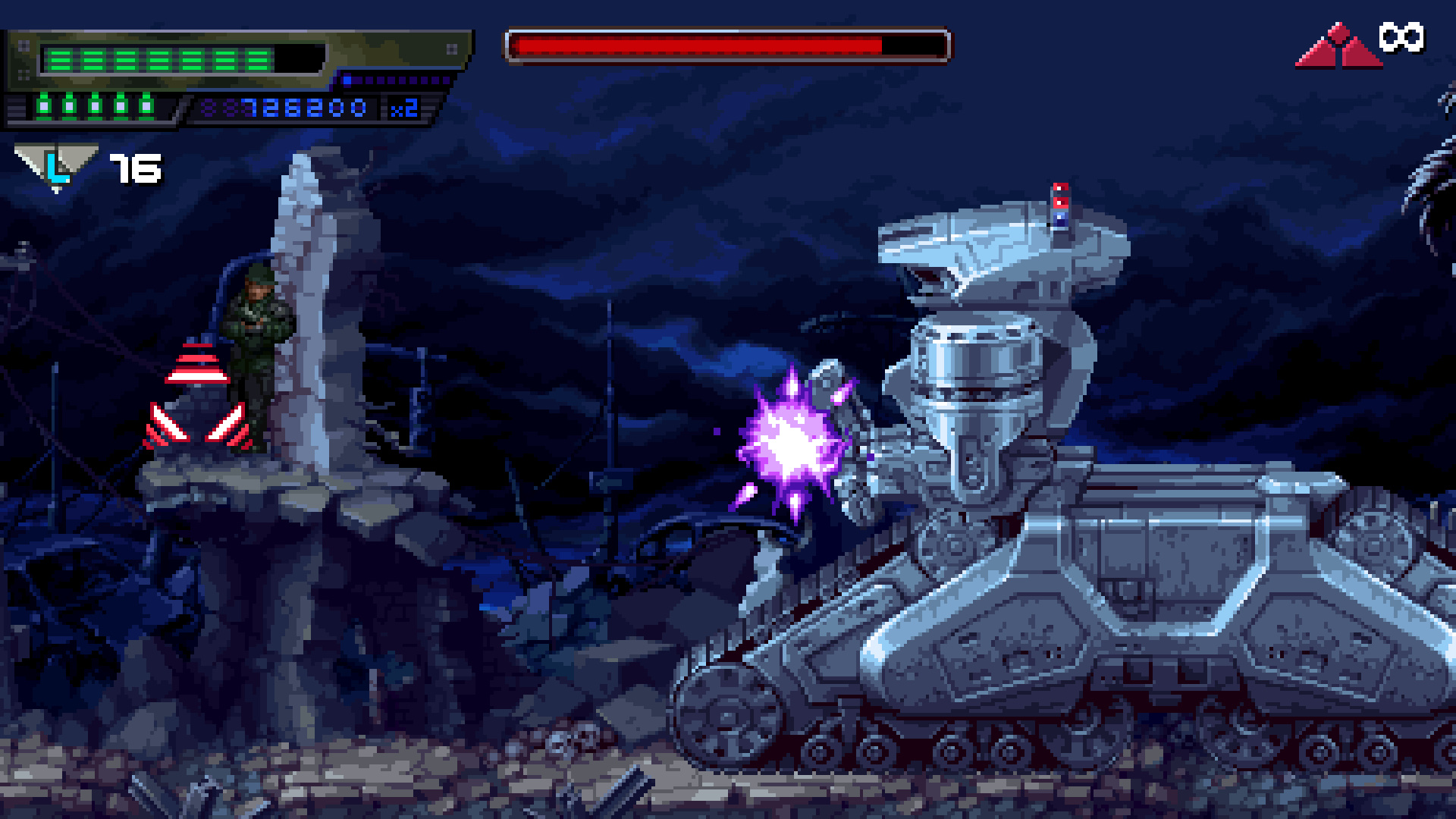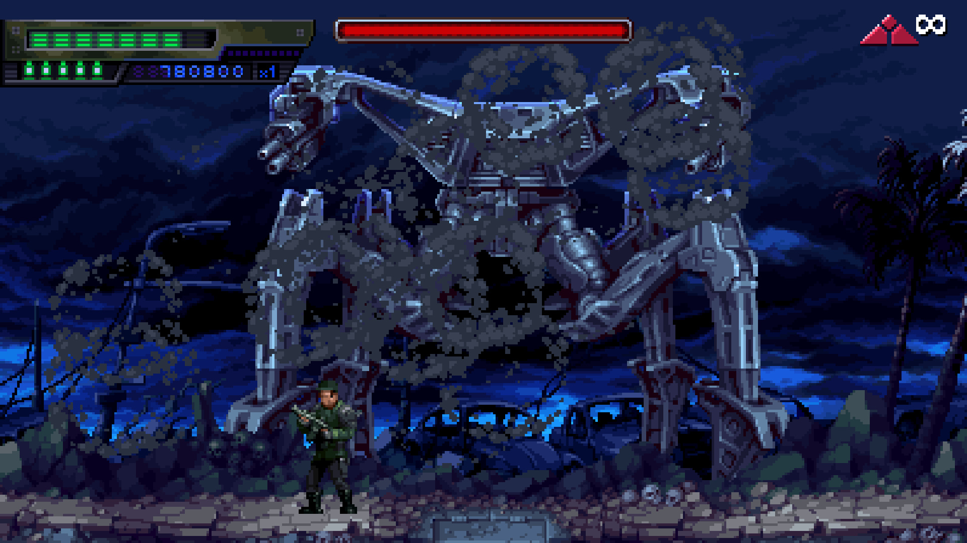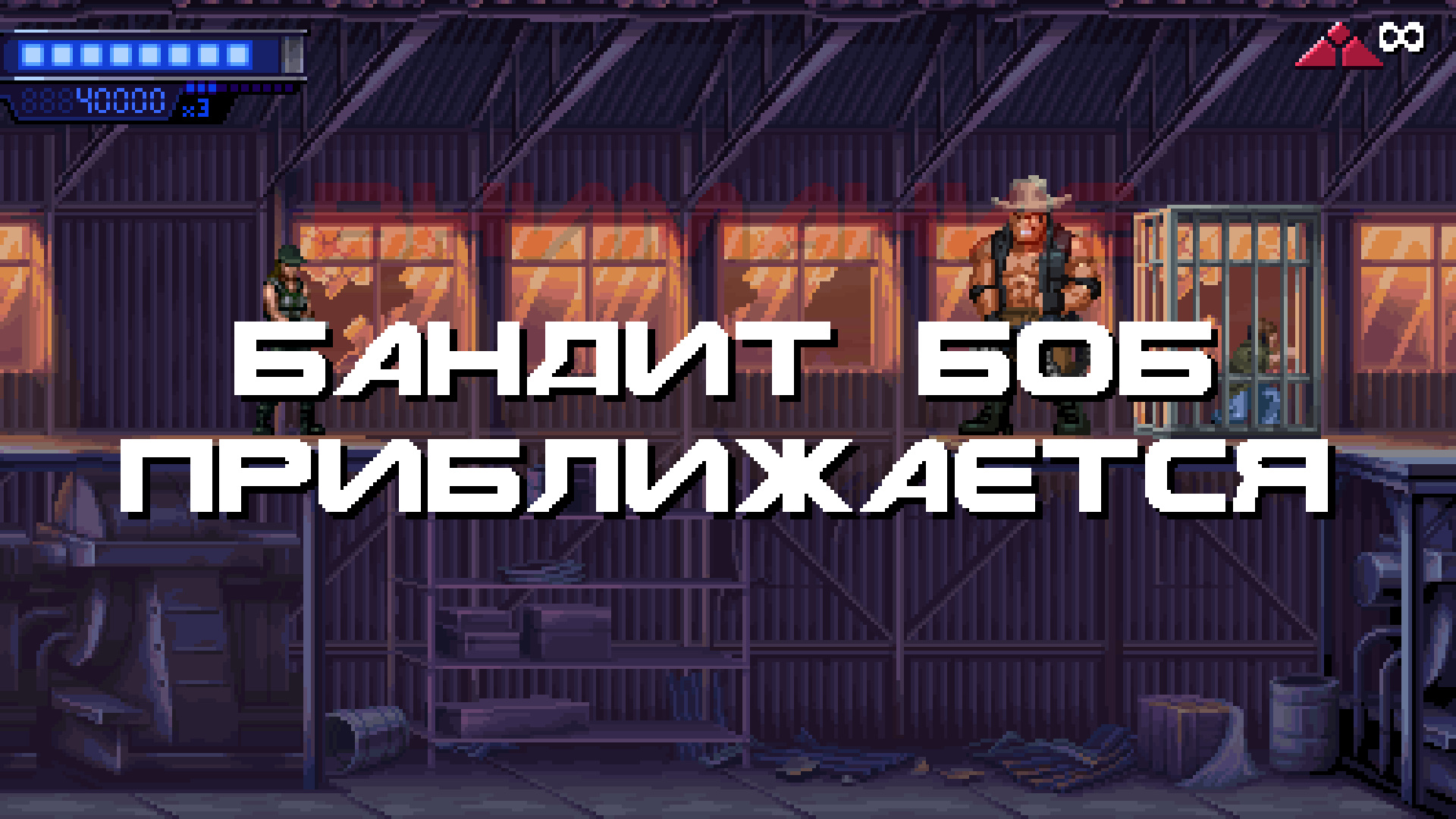 Ближе к концу уровня появится босс. Все, что вам нужно сделать, чтобы избежать урона — либо стоять позади Боба на краю экрана (если он слева, вы должны стоять у левого края), либо находиться в противоположной стороне, но на той же высоте. В таком случае достаточно пригнуться и стрелять в Боба, пока тот атакует из своего пулемета. Он по вам не попадет.