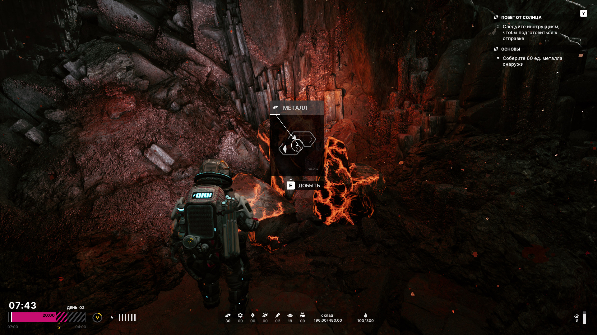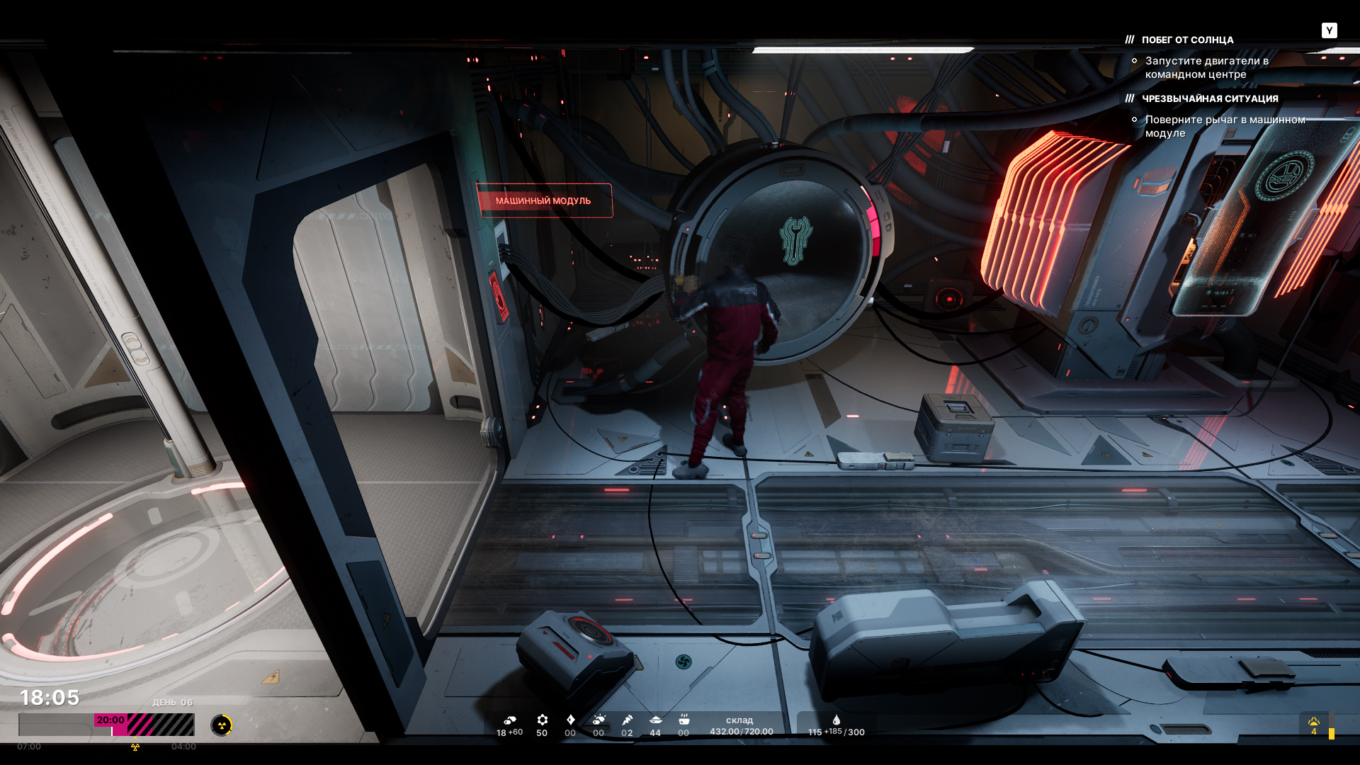 Вы узнаете, что всякий раз, когда приближается рассвет (каждые несколько дней), нужно перемещать базу, иначе та сгорит от экстремально высокой температуры. Первый этап — собрать 60 единиц металла снаружи. Ночью выходить наружу запрещено, так что спуститесь на лифте дважды вниз и войдите в капитанскую каюту. Ложитесь отдыхать.