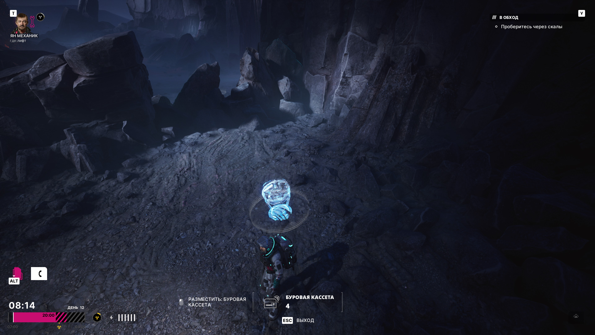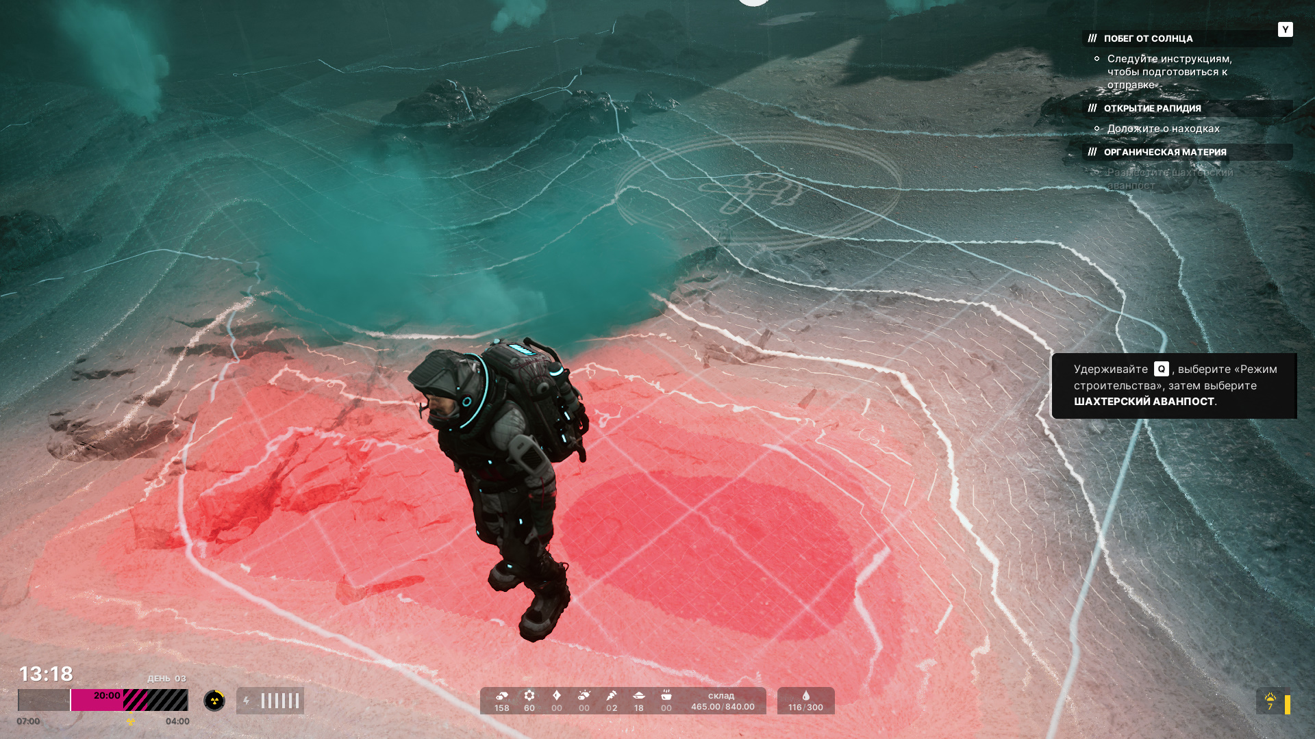 Также у вас уже должен быть крюк, при помощи которого можно подниматься на возвышенности. На это расходуется энергия скафандра (2 единицы). Вам доступно 6 единиц энергии на вылазку. В мастерской можно создать батарею, заряжающую скафандр. В целом кирку используйте только в том случае, если рядом действительно нет альтернативного маршрута.