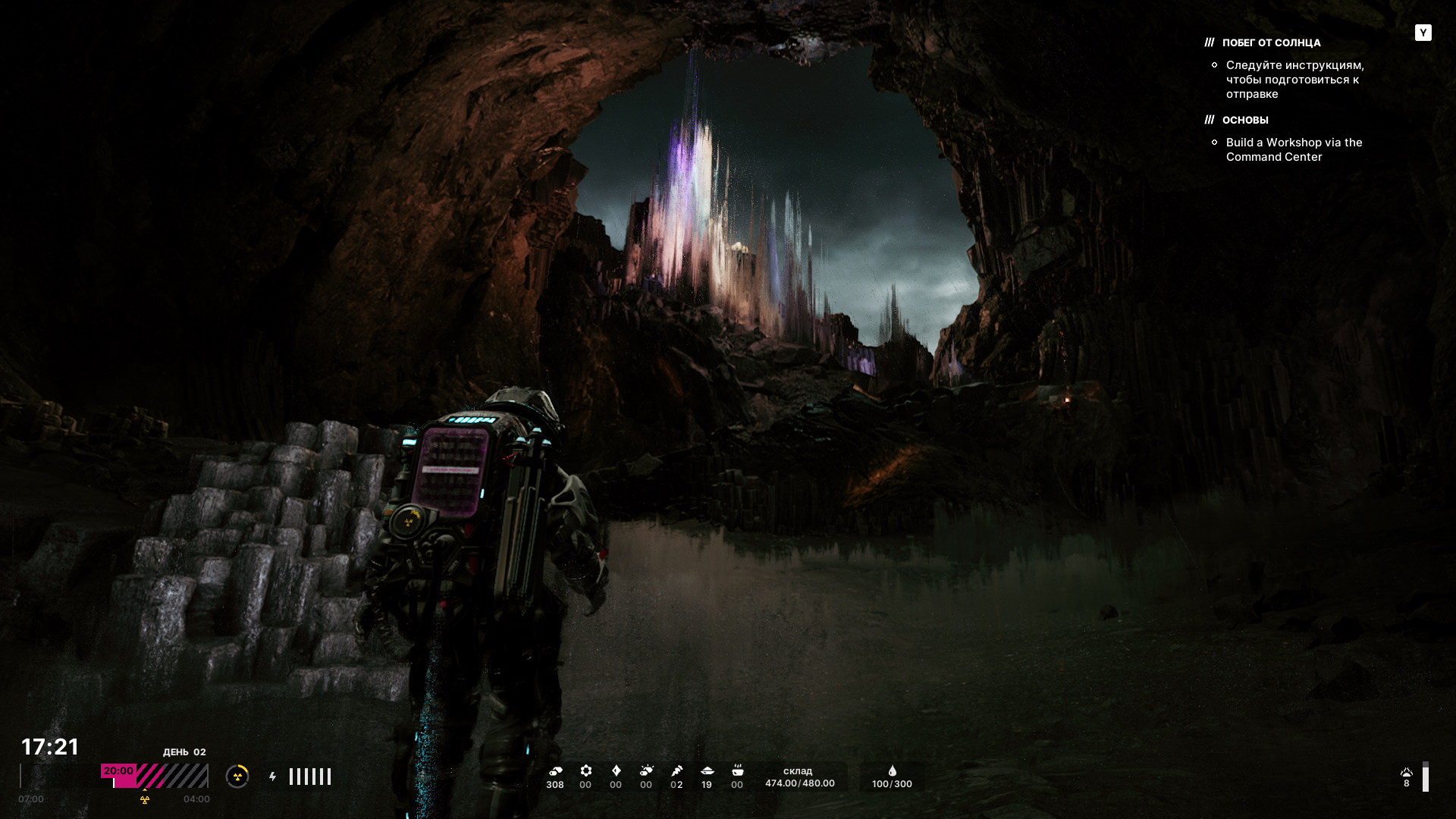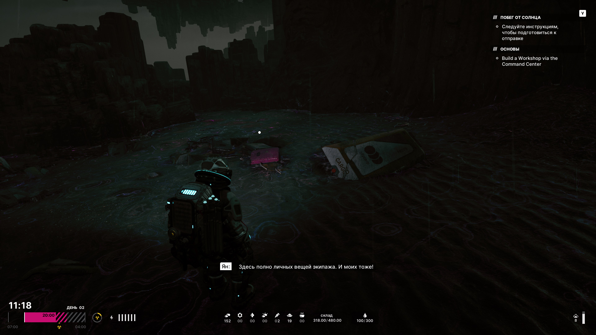 Выберитесь наружу и исследуйте окрестности. Вы сможете найти личные вещи Яна (набор для мате, мультитул и скакалку) и первое кино «История вселенной», которое можно посмотреть на базе. Также соберите металл и органику. Внутри пещеры на севере есть залежи рапидия. Следите за вместимостью и заполненностью склада внизу экрана. Если склады будут переполнены, вы не сможете собрать ресурсы. Когда это произойдет, вернитесь на базу.