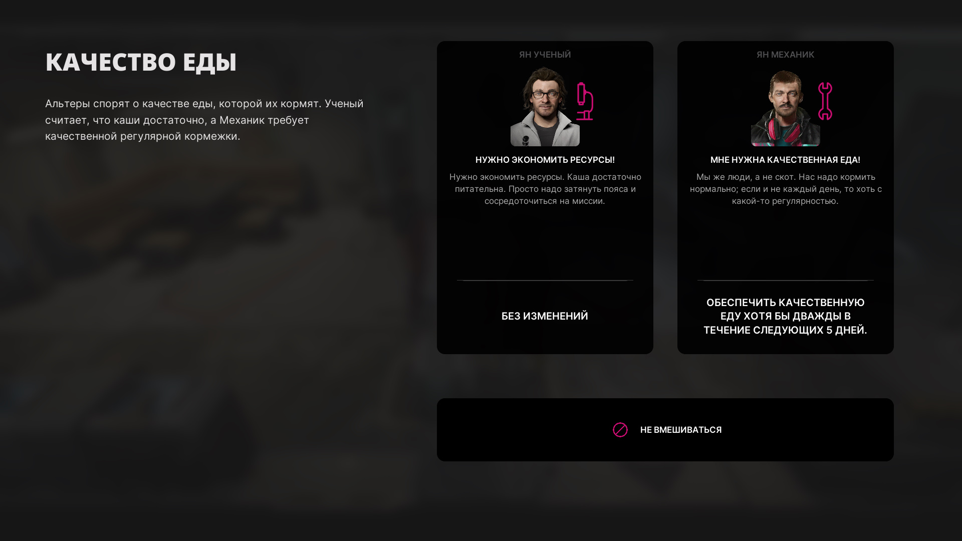 Затем вы застанете спор на кухне — о качественной еде. Будут спорить Ученый и Механик. Если вступитесь за механика, придется обеспечить качественную еду хотя бы в два дня из ближайших пяти. Вам нужно построить оранжерею, затем вырастить там сырую пищу (самостоятельно или назначить альтера), а после приготовить ее на кухне. 8 порций будет достаточно. Засчитываются любые два дня, при этом само задание завершится через 5 дней. Если все хорошо, слева внизу появится уведомление, что альтеры довольны тем, что вы сдержали обещание.