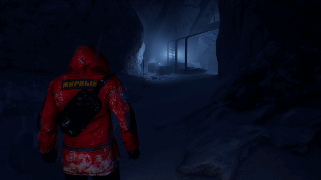 Напротив есть лаз в леднике. Проберитесь сквозь него, используя клавишу взаимодействия. Двигайтесь по фонарям через буран, пока не обнаружите станцию «Восток».