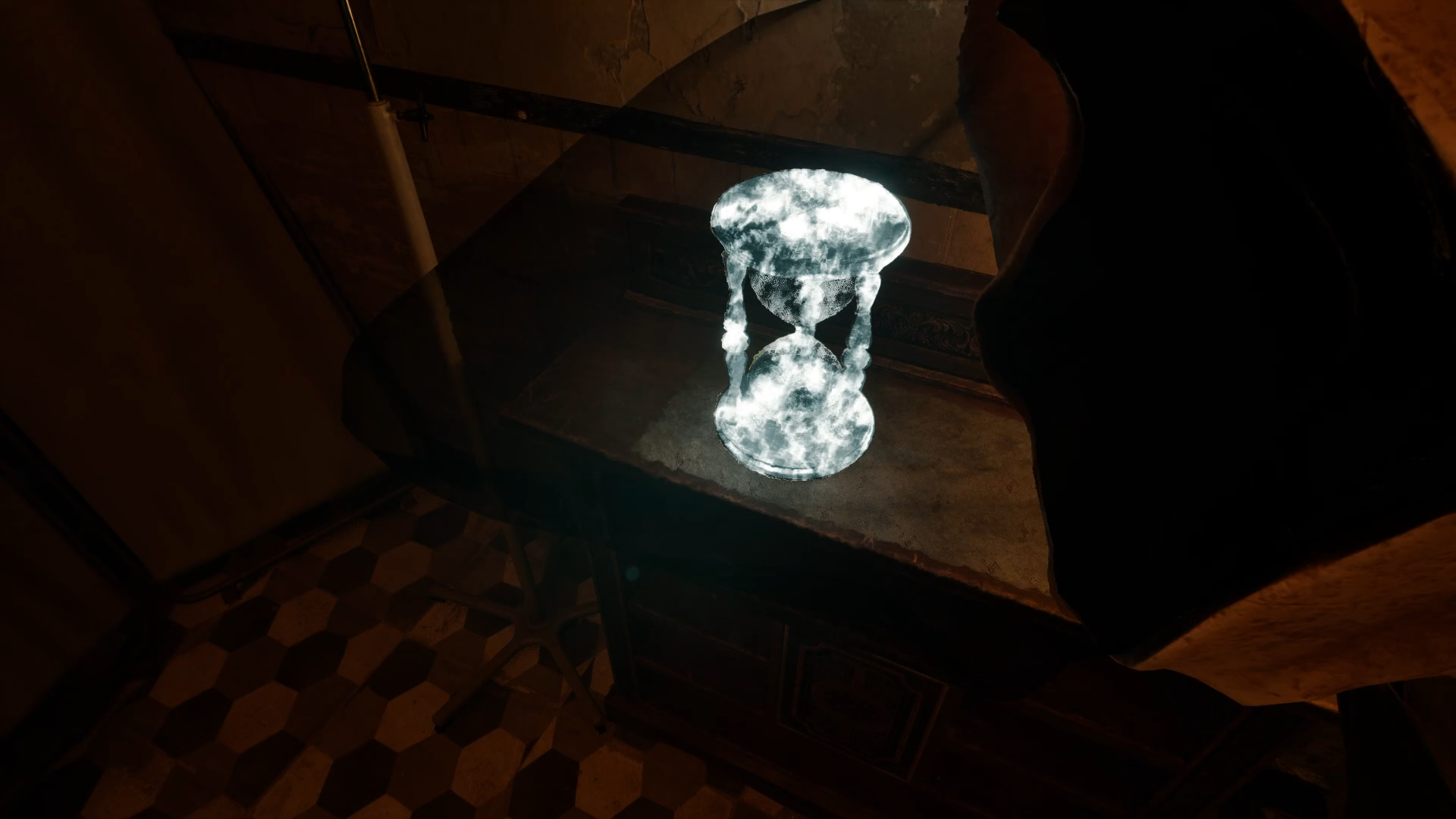 Идите в коридор слева и осмотрите дверь лифта, в которой застрял стетоскоп. Войдите в кабинет Consulting B и осмотрите труп доктора слева. Алан отметит, что его шея еще теплая. Подойдите к тумбе напротив стола доктора и примените зрение истины, чтобы появились песочные часы. Взаимодействуйте с ними. Вы разблокируете вторую способность — «Временной сдвиг».