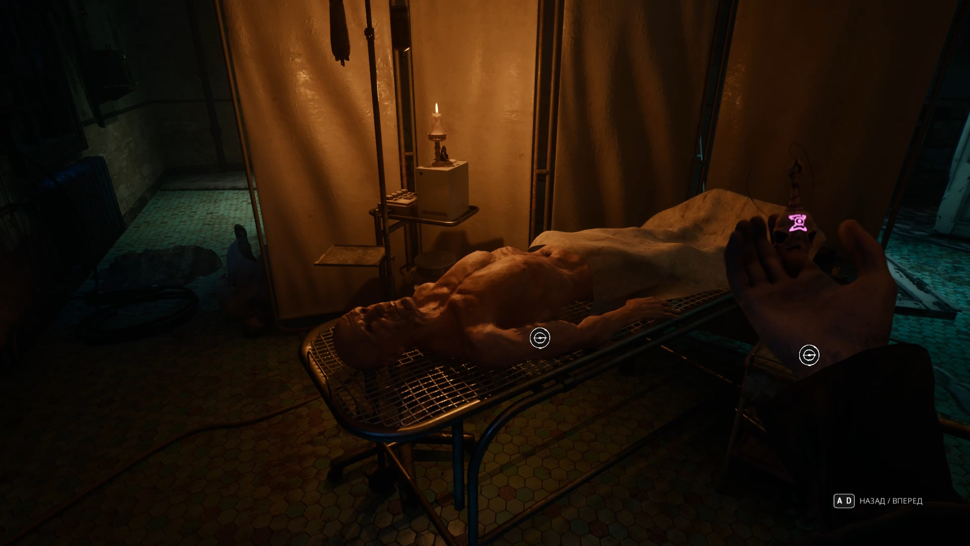 Первая дверь справа закрыта, а вторая выбита. Пройдите через нее и сверните влево. В середине есть труп на каталке. Примените «Временной сдвиг» и отмотайте время, чтобы снять с тела ткань человеческого тела недавно умершего.