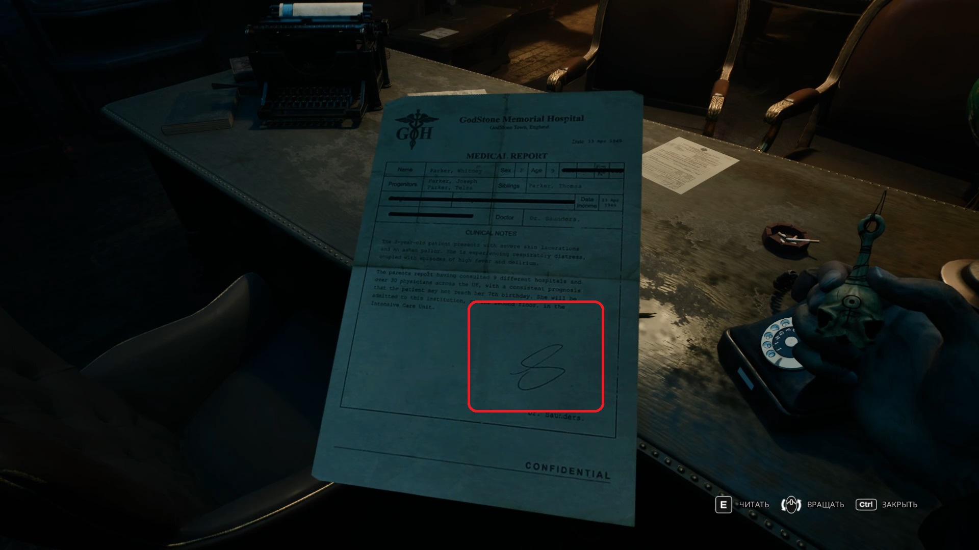 Вернитесь в коридор и идите прямо, в соседний коридор, где находится лифт. Только на этот раз вы будете по другую сторону барьера. Шкаф можно сдвинуть. Но до шкафа слева есть уборная без двери, а справа — кабинет докторов. Войдите внутрь. Главное, что вас интересует — документ на основном столе директора, на котором стоит образец подписи Сондерса.