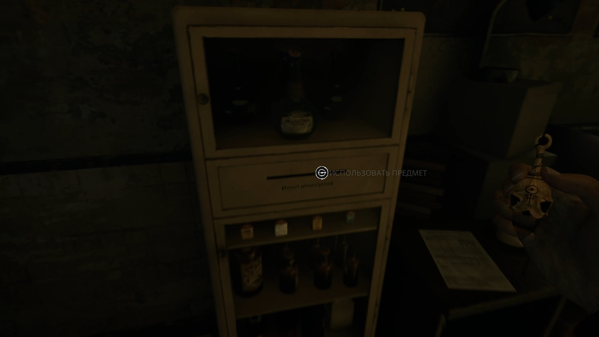 Примените подписанный рецепт на белый шкафчик с медикаментами слева, чтобы получить белладонну.