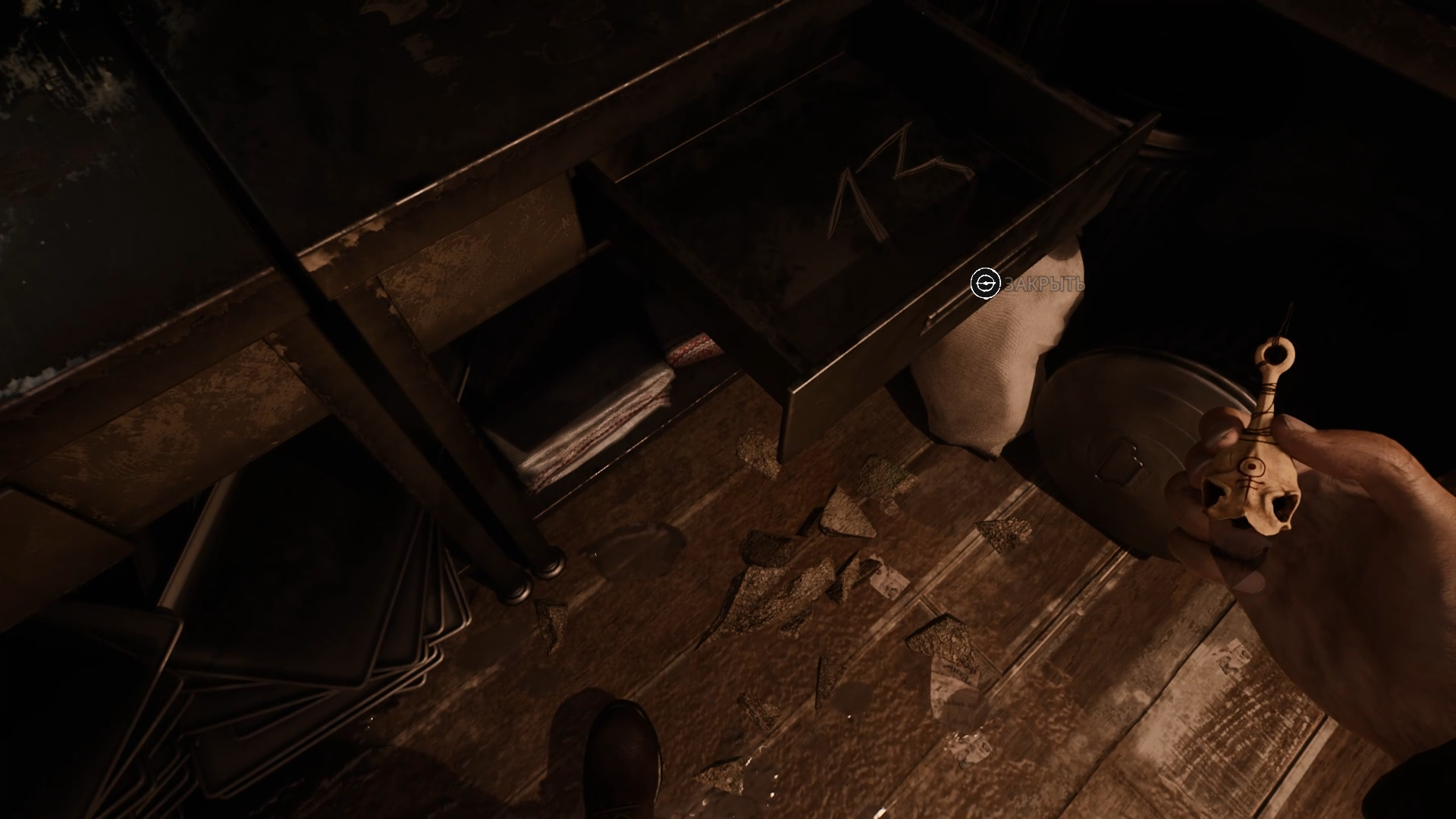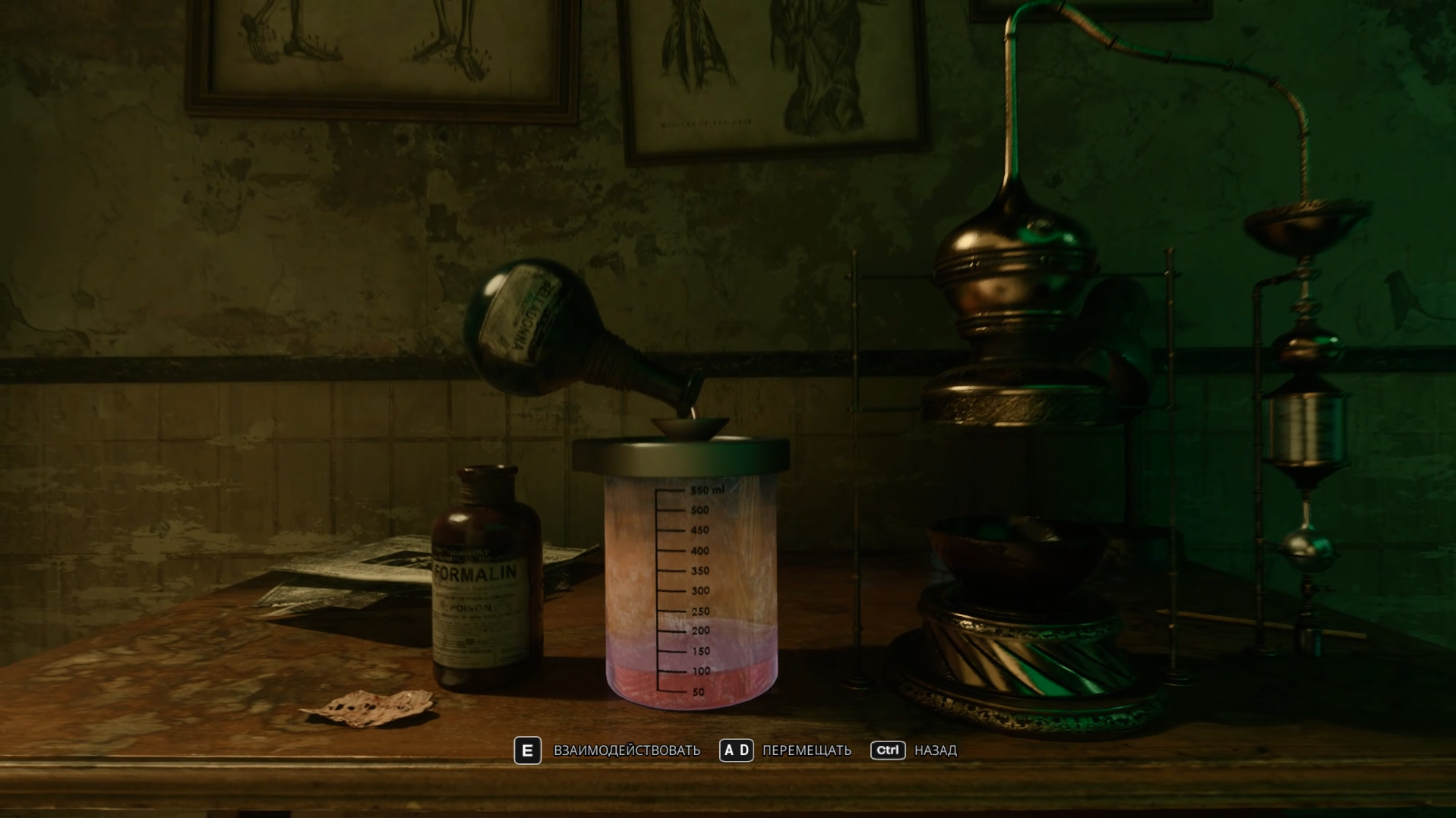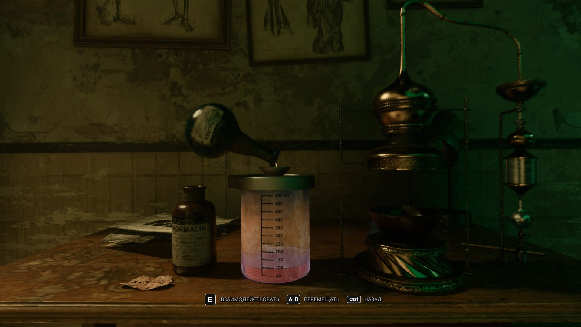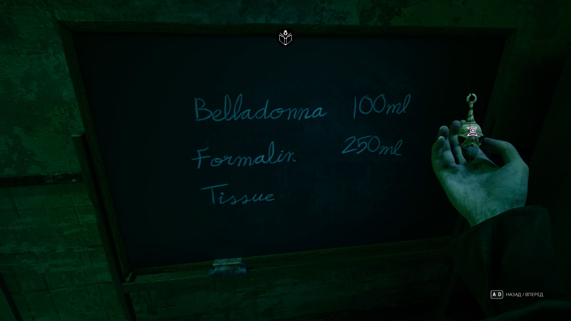 Игра чувствительна к тому, как будет выглядеть череп. Жмите клавишу E для проверки. Если все правильно, ванночка раскроется, и вы получите формалин.