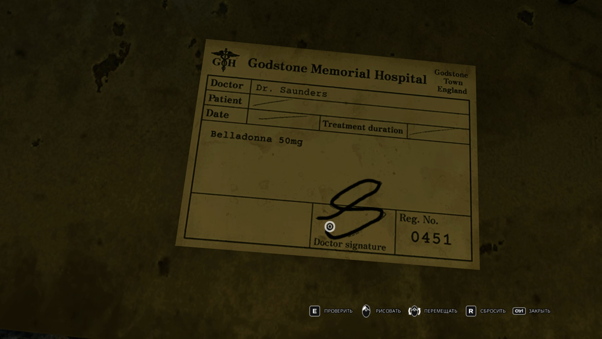 Также пройдите к рецепту и подпишите его. Нужна подпись Сондерса, вы увидели ее ранее. Вы получите рецепт Сондерса.