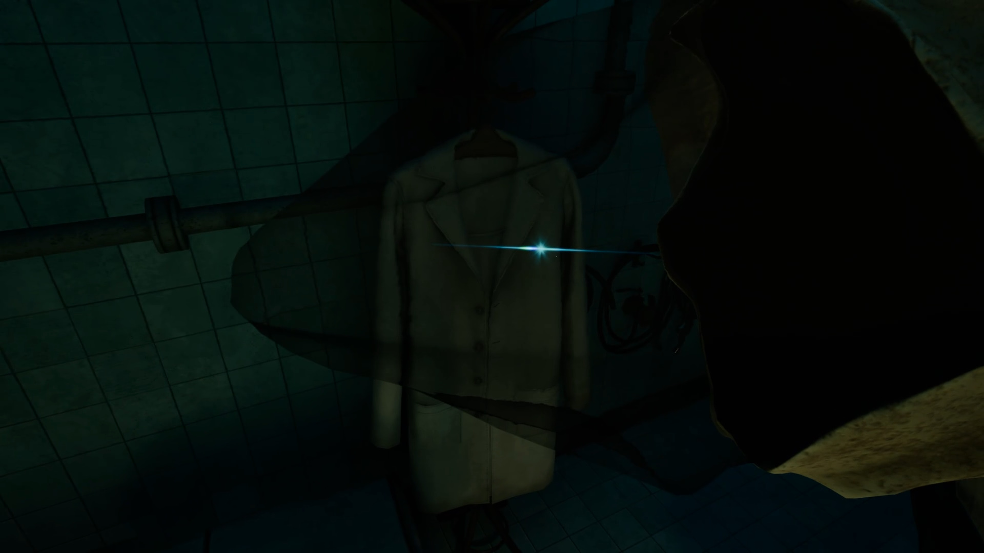 Самое главное другое: найдите на стене дальше ванночек медицинский халат. Примените «Зрение истины», чтобы увидеть бейджик доктора Оливера. OLIVER — тот самый доктор, призрак которого вы видели в комнате через кабинет Сондерса.