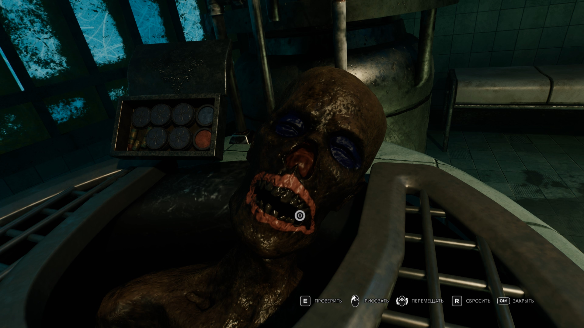 Бегите обратно в помещение с ванночками и трупами. Взаимодействуйте с трупом слева. Теперь вам нужно раскрасить его так же, как женщину справа. Глаза должны быть синими, нос и губы — красными: