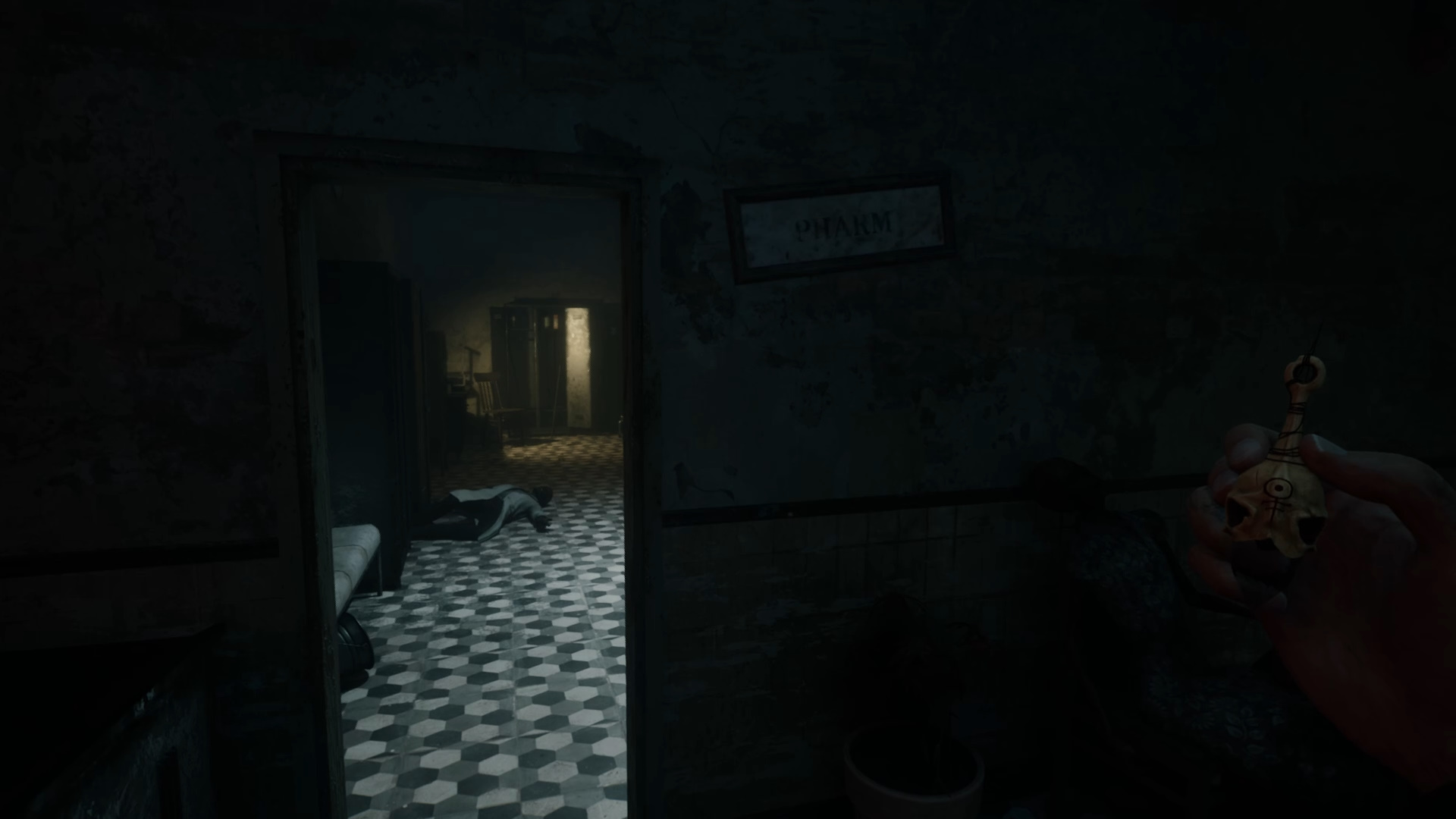 Покиньте кабинет и проберитесь в уборную напротив, чтобы забрать с трупа на полу медальон (4/15).