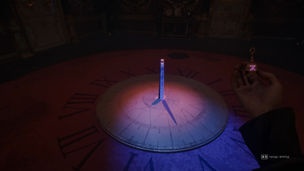 Далее нужно взаимодействовать со штырем в центре комнаты (штырь от солнечных часов) через перемотку времени. До тех пор, пока не опустите второе зеркало и не увидите минутную (длинную) стрелку.