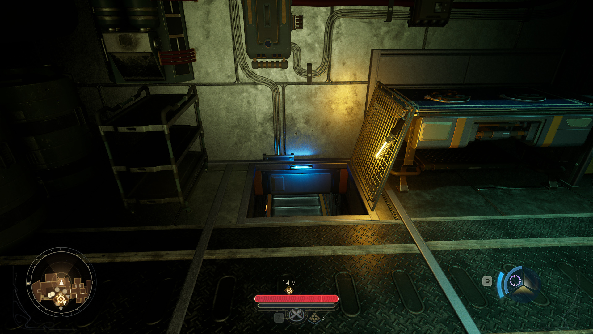 Если у вас нет ни того, ни другого, придется искать обходной путь. Пройдите мимо неисправной двери и спрыгните в вентиляционное отверстие в левой части кухни. Через него можно пролезть в свою каюту.