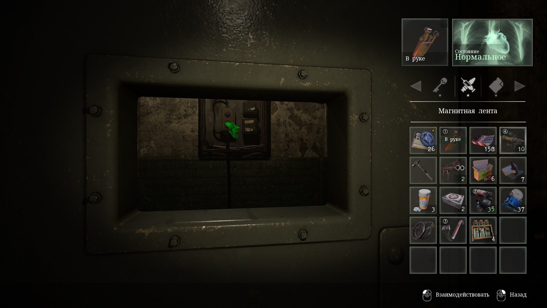 Пройдите в подвал, подойдите к запертой двери неподалеку от двери Приемной и осмотрите устройство слева. Оно используется для распознавания речи. Откройте инвентарь, осмотрите кассетный плеер и верните в него батарейки. В тот же плеер вставьте аудиокассету «Покаяние». Нажмите на кнопку воспроизведения, затем взаимодействуйте с панелью около двери. Как только услышите, как человек скажет The Password is…, спрячьте плеер и быстро нажмите на красную кнопку устройства распознавания речи на стене слева: