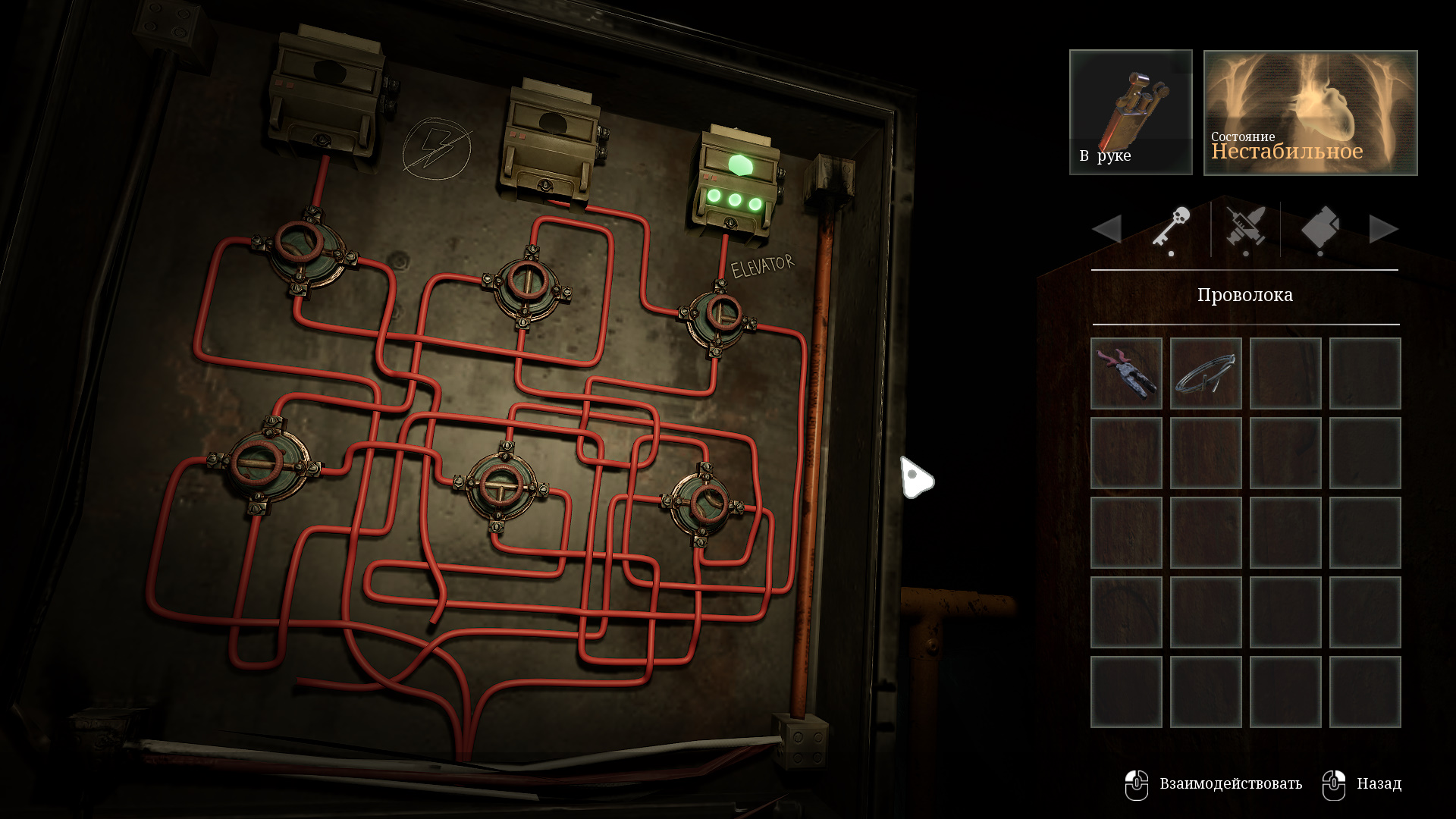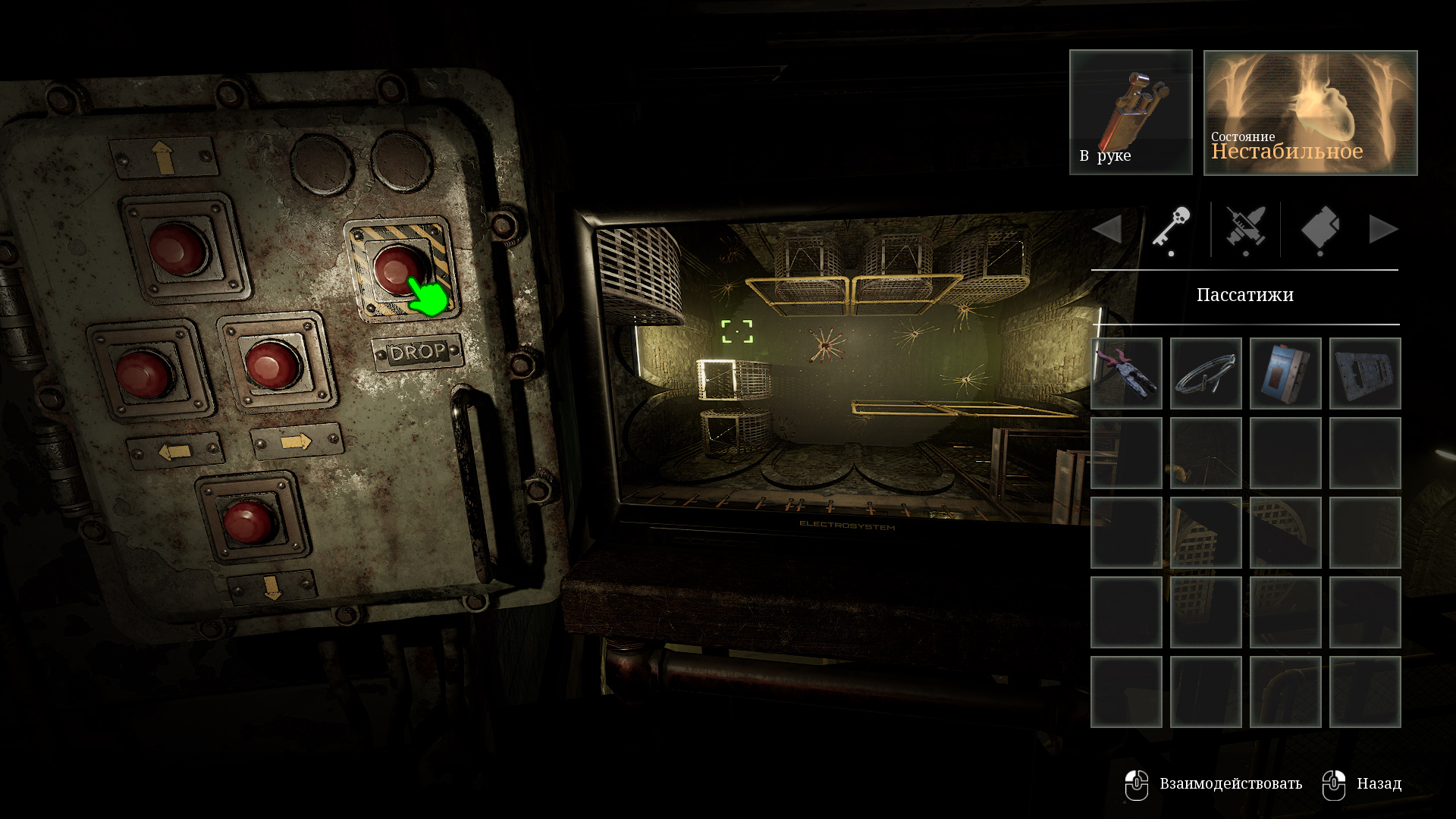 Идите в коридор, разбейте два деревянных ящика и заберите с тележки слева гвозди. Нажмите на красную кнопку в щитке в конце коридора с камерами, войдите в открывшуюся камеру напротив. Возьмите гвозди с прикроватной тумбы и видеокассету (Морозильник) с кровати. Вернитесь в зал для собраний Нижнего крыла (комната, в которую вы попали из холла в самом начале) и используйте видеокассету (Морозильник) на проекторе. Для начала нажмите на кнопку с «треугольником», чтобы открыть слот под кассету.