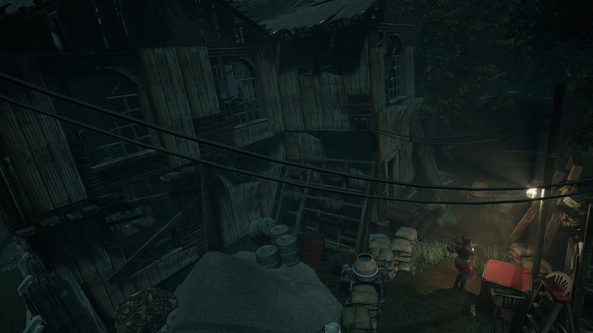 Идите вперед и возьмите бензин с красной бочки. Найдите повидон на торговом прилавке, затем перейдите по деревянному мосту. Поднимитесь по лестнице, возьмите со стола патроны для дробовика и войдите в разрушенный дом.