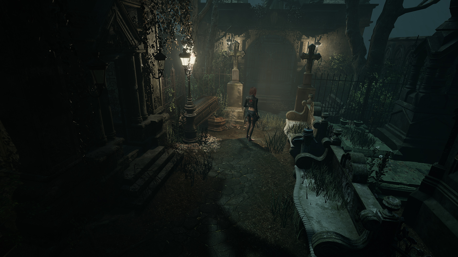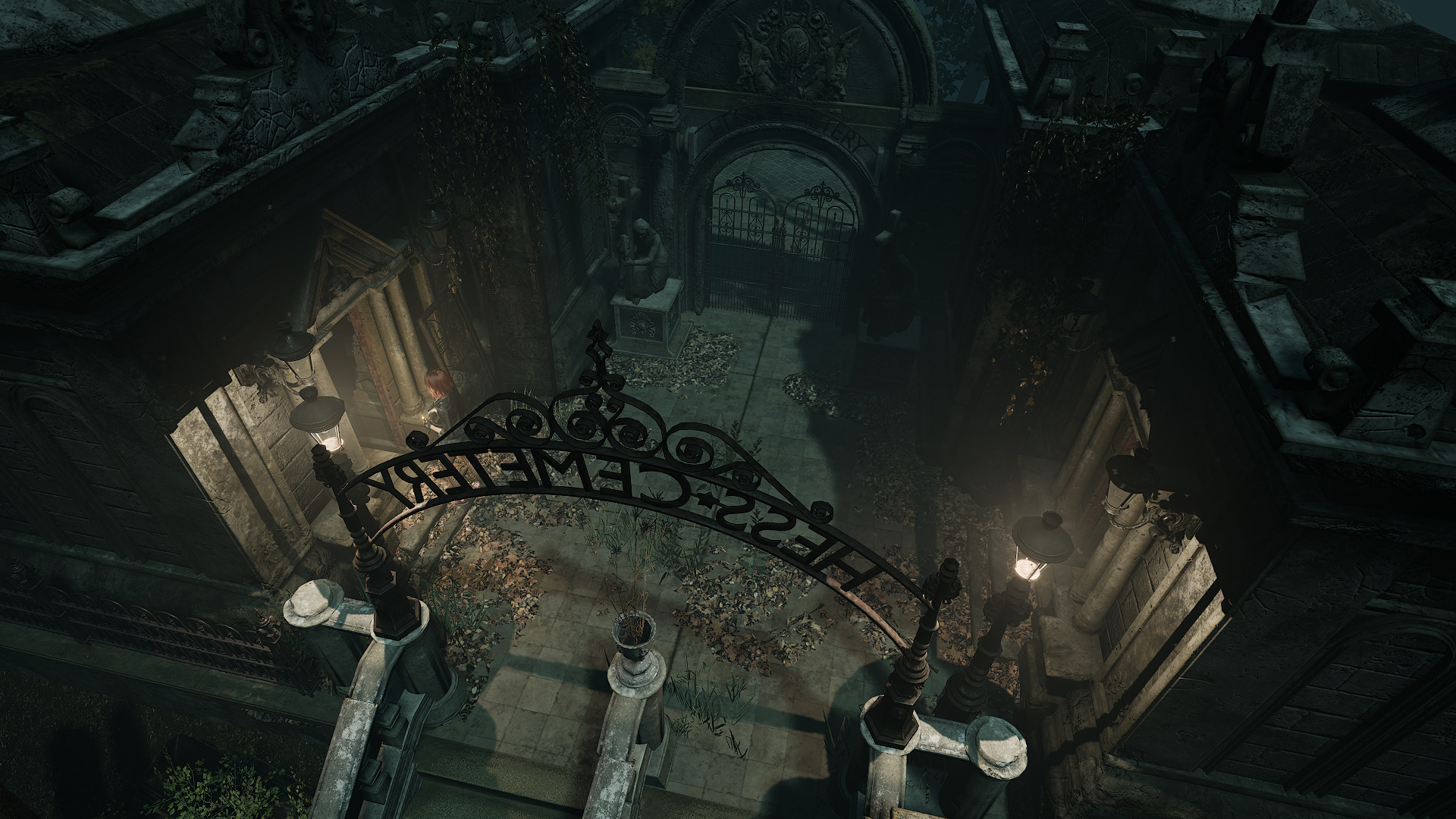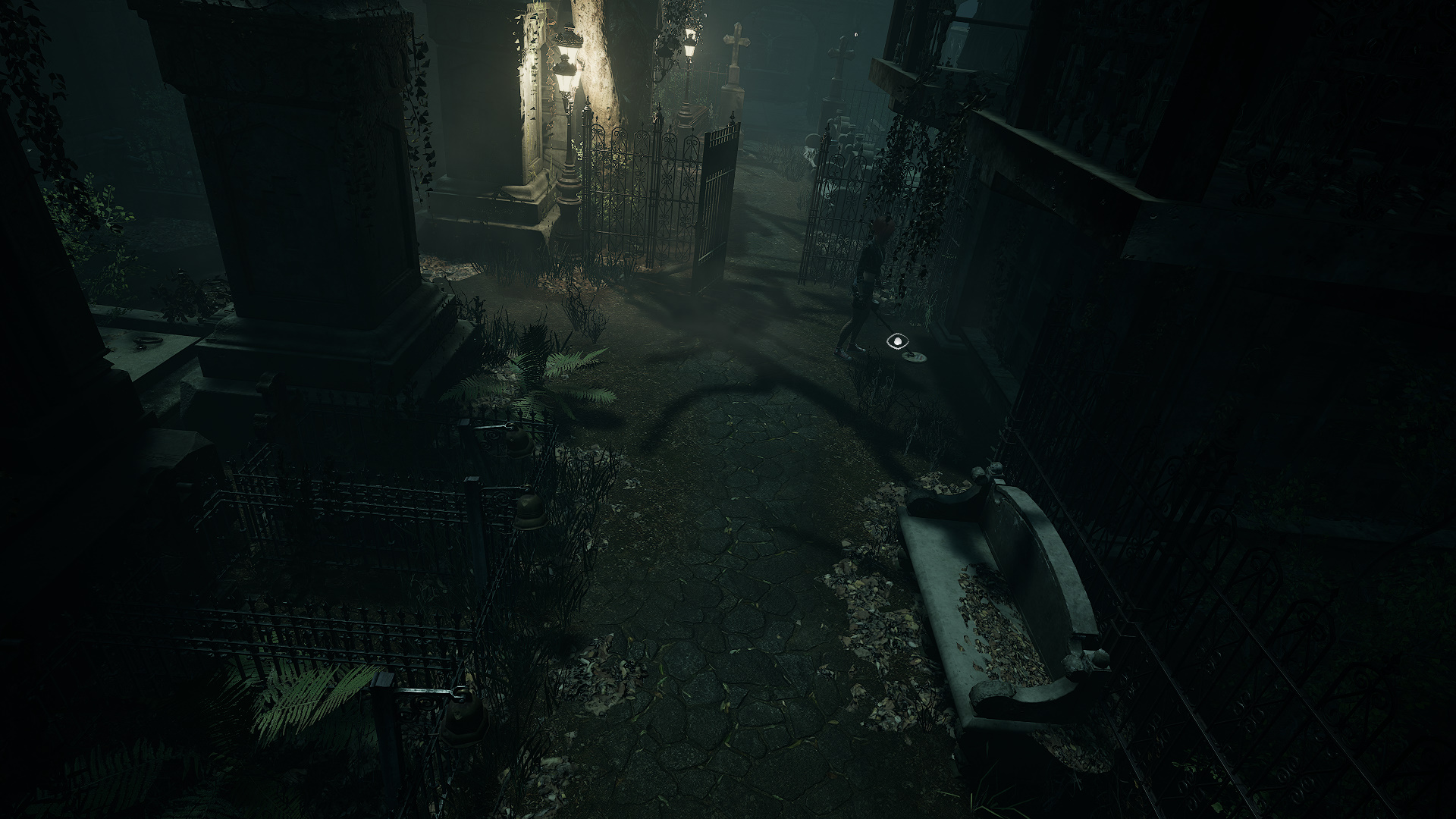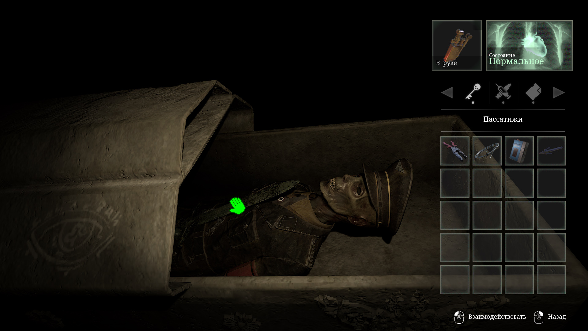 Обойдите могилу и нажмите на светящуюся панель, чтобы активировать лифт. Войдите в катакомбы. Следуйте по тропинке и зажгите свечи, чтобы разбить ящики. Войдите в комнату справа, чтобы найти старую фотографию. Продолжите движение по тоннелю, пока игнорируйте деревянную дверь справа и идите в конец коридора. Зажгите все свечи в комнате, а затем подберите гвозди и обезболивающие. Поднимитесь по небольшой лестнице и достаньте из гроба мраморный меч.