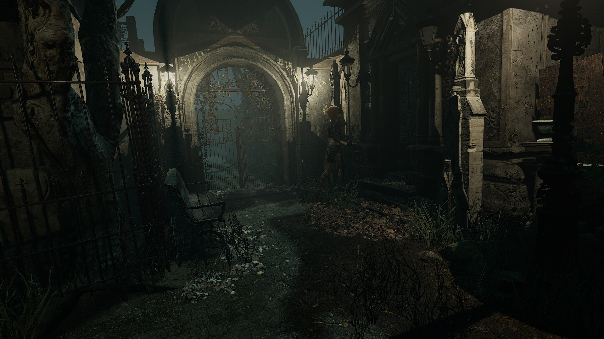 Не проходите через них, а вместо этого развернитесь и войдите в ближайший мавзолей, чтобы найти патроны для дробовика. Идите к большому мавзолею в конце и используйте ключ с трилистником, чтобы открыть ворота и убить призрака: