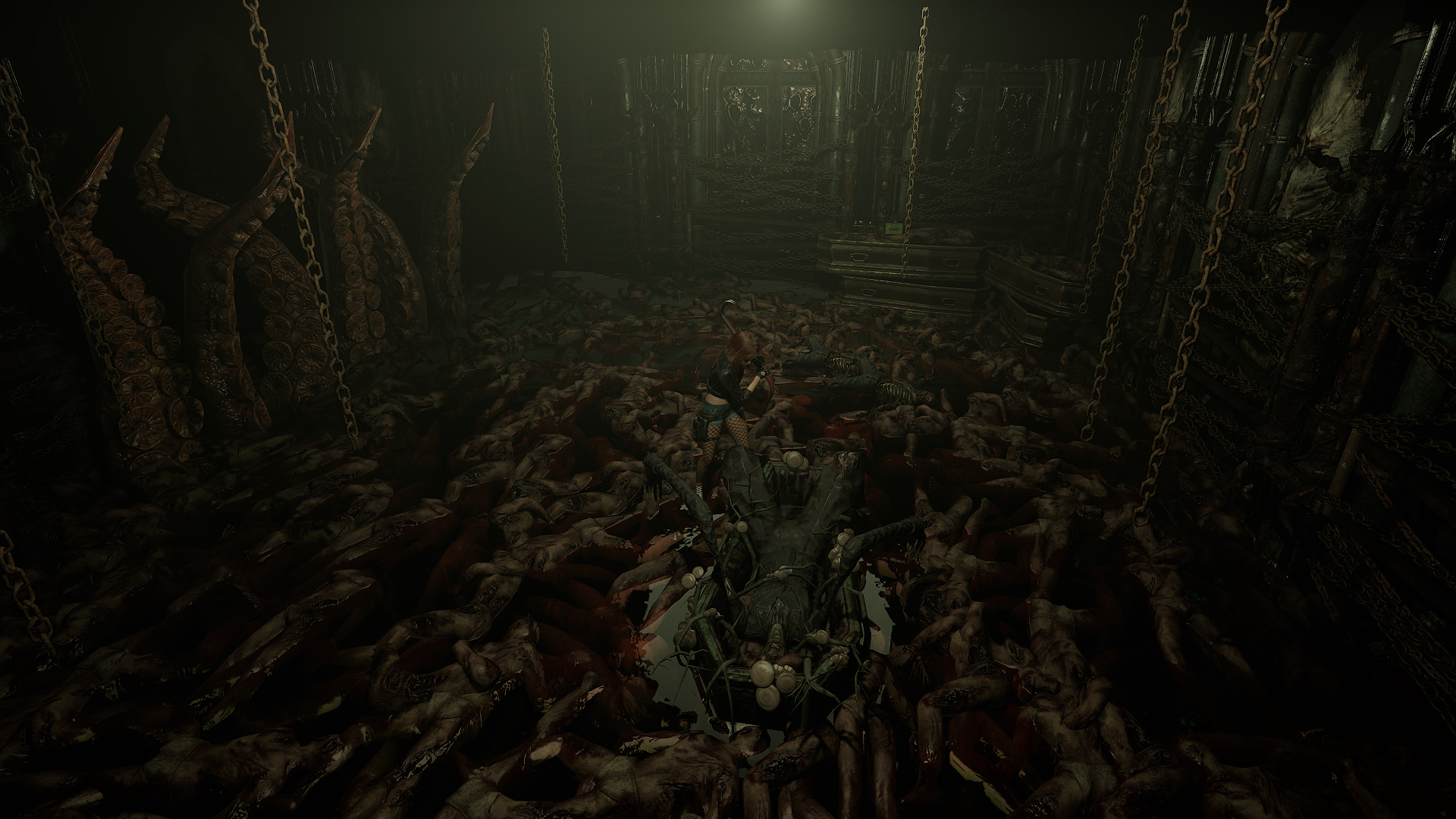 Прежде чем спускаться на лифте, вернитесь в кабинет на кладбище и сохранитесь, поскольку вас ждет битва с боссом. Езжайте вниз на лифте, и после кат-сцены окажетесь в Общей Могиле (Иной Мир). Как только начнете двигаться, появится босс. Чтобы нанести ему урон, сначала нужно убить всех врагов. Постарайтесь бегать вокруг и собрать мобов вместе, а затем использовать дробовик или арбалет, чтобы убить всех одним выстрелом.