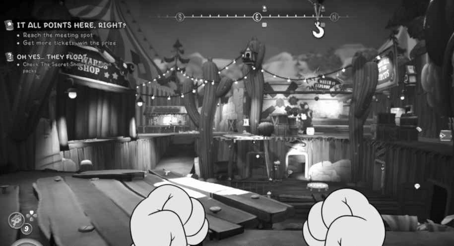 Когда откроете дверь, для которой нужны 4 билета «Секретного шоу», пройдите в левую часть области. Отыщите киоск с барной стойкой, на которой лежат воздушные шарики. Купите их за 25 монет.