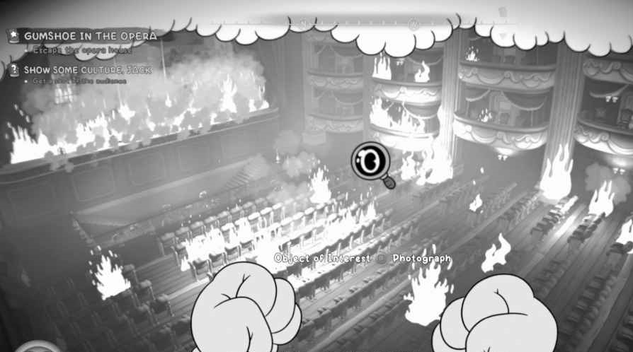 После победы над Примадонной оперный театр загорится. Следуйте через уровень по основному пути, пока не доберетесь до одного из балконов в театральном зале. С балконов появится возможность сфотографировать горящий зрительный зал.