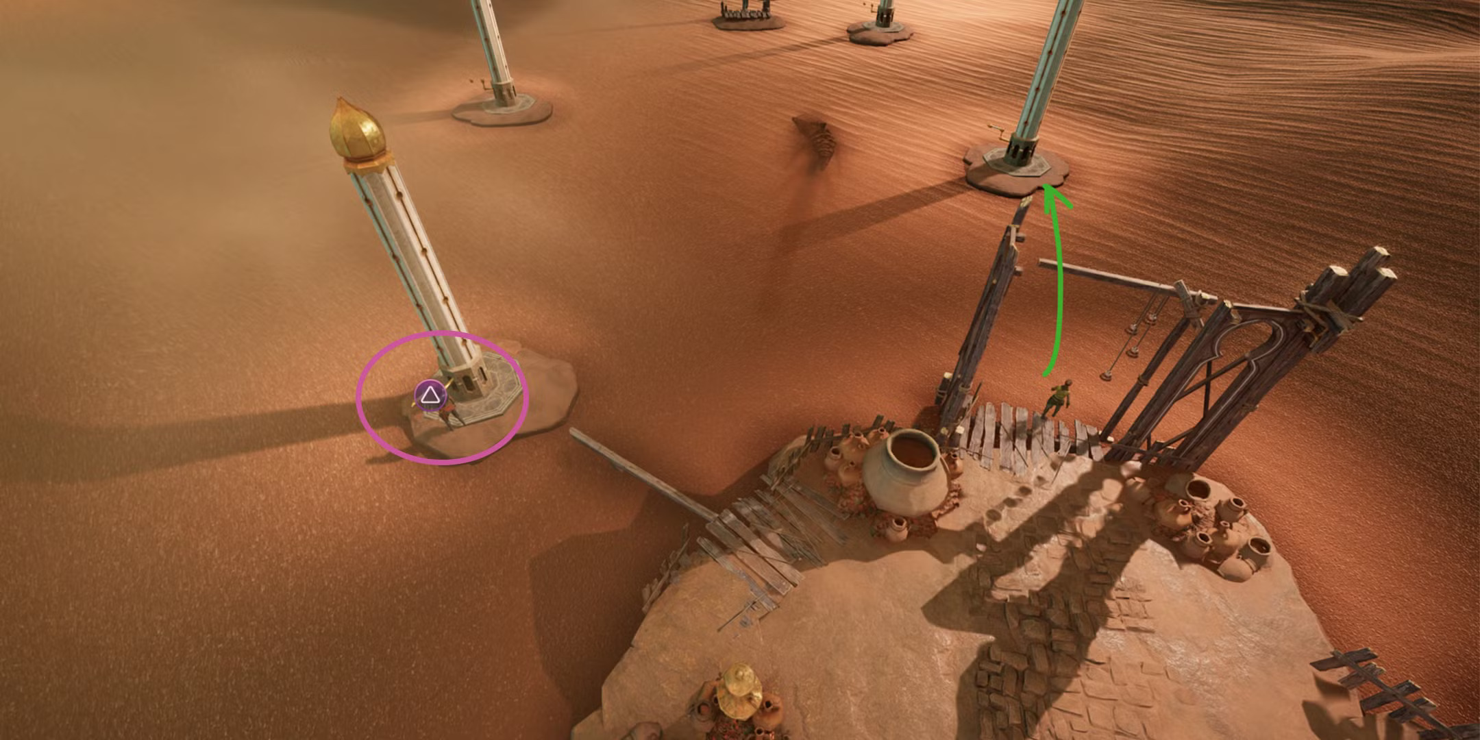 Далее Мио и Зои снова работают вместе, чтобы поднять трос, погребенный в песок. Перебравшись на другую сторону по тросу, сначала заберитесь на более низкий столб, затем перепрыгните на более высокий.