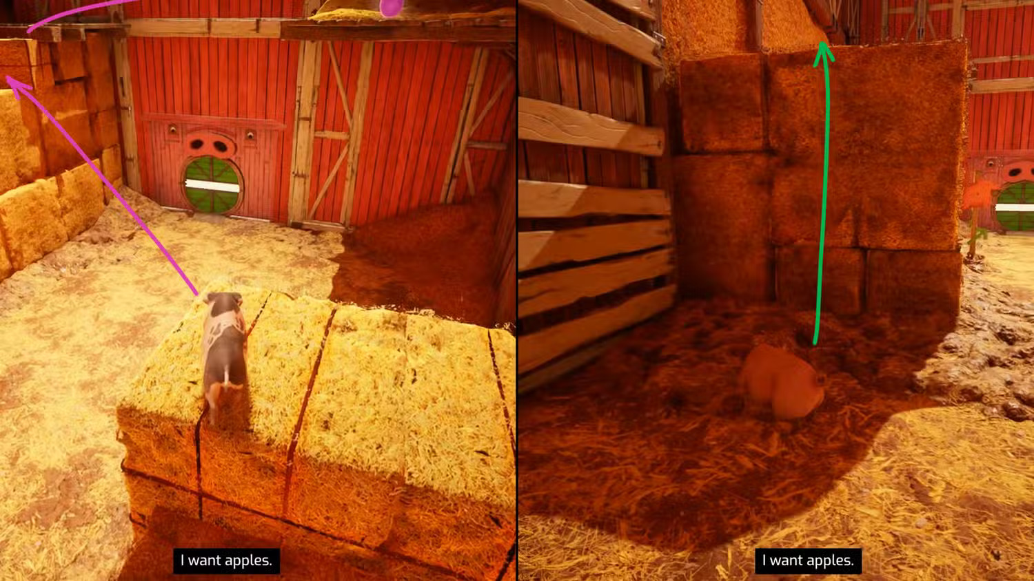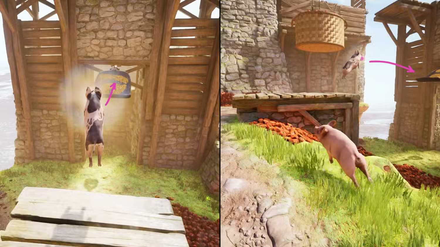 Чтобы перемещаться по уровню, каждая свинья должна найти свое яблоко: Мио — фиолетовое, Зои — зеленое. Чтобы пройти через первую дверь, игрокам нужно воспользоваться своими особыми навыками. Зои нужно подняться на сено слева и с помощью пружины оказаться вверху. Мио следует выбрать правый путь и воспользоваться «рывком» в полете, чтобы перепрыгнуть препятствие.