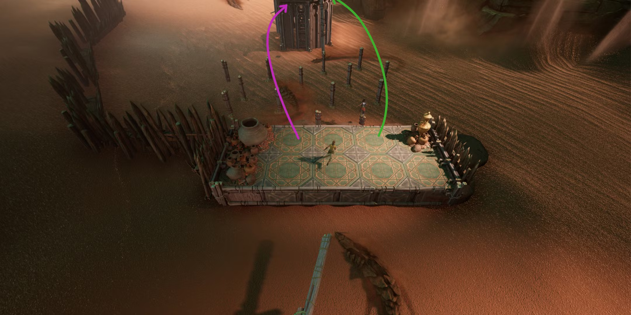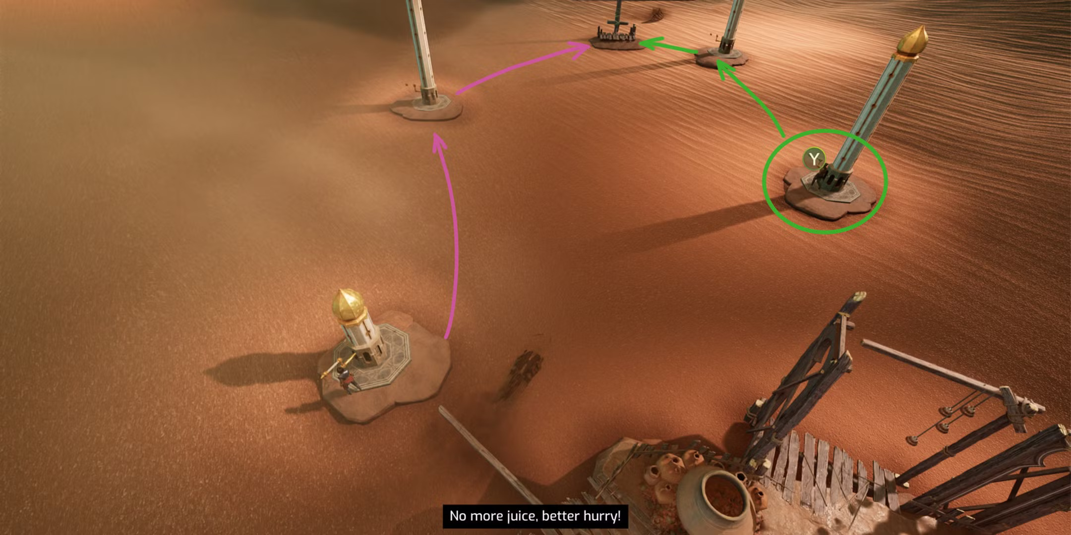 Например, пусть Зои останется на основном островке, напротив правого островка с башней, в то время как Мио должна перепрыгнуть к башне слева. Мио взаимодействует с левой башней, отвлекая песчаную рыбу, пока Зои бежит к следующей.