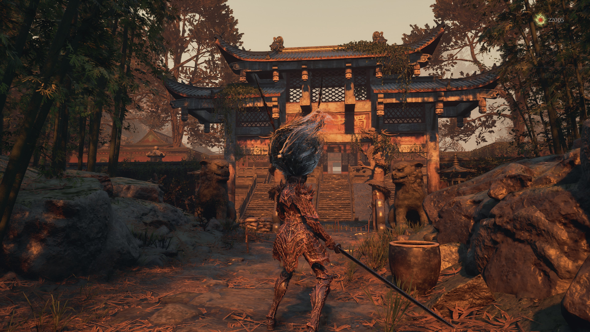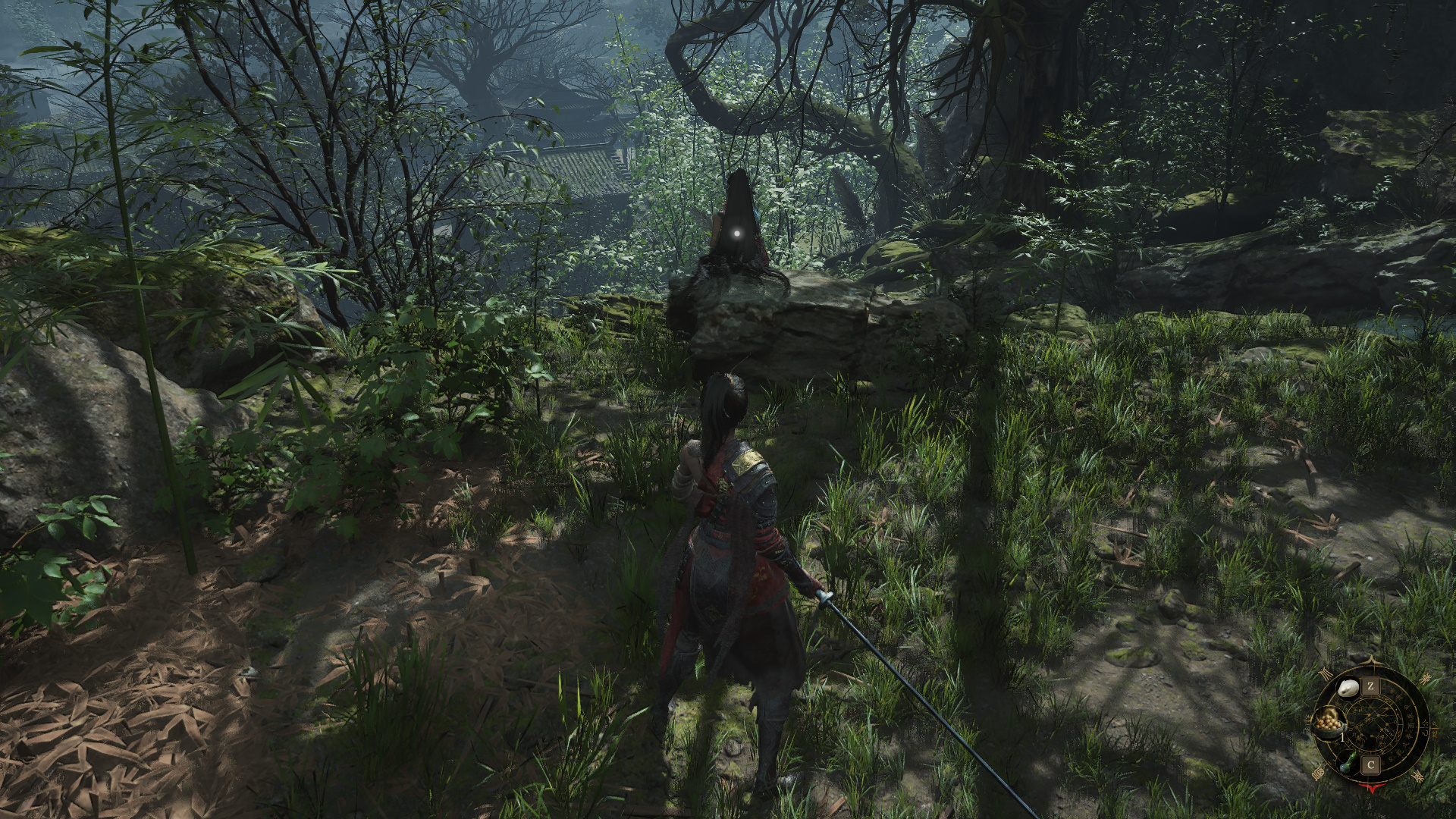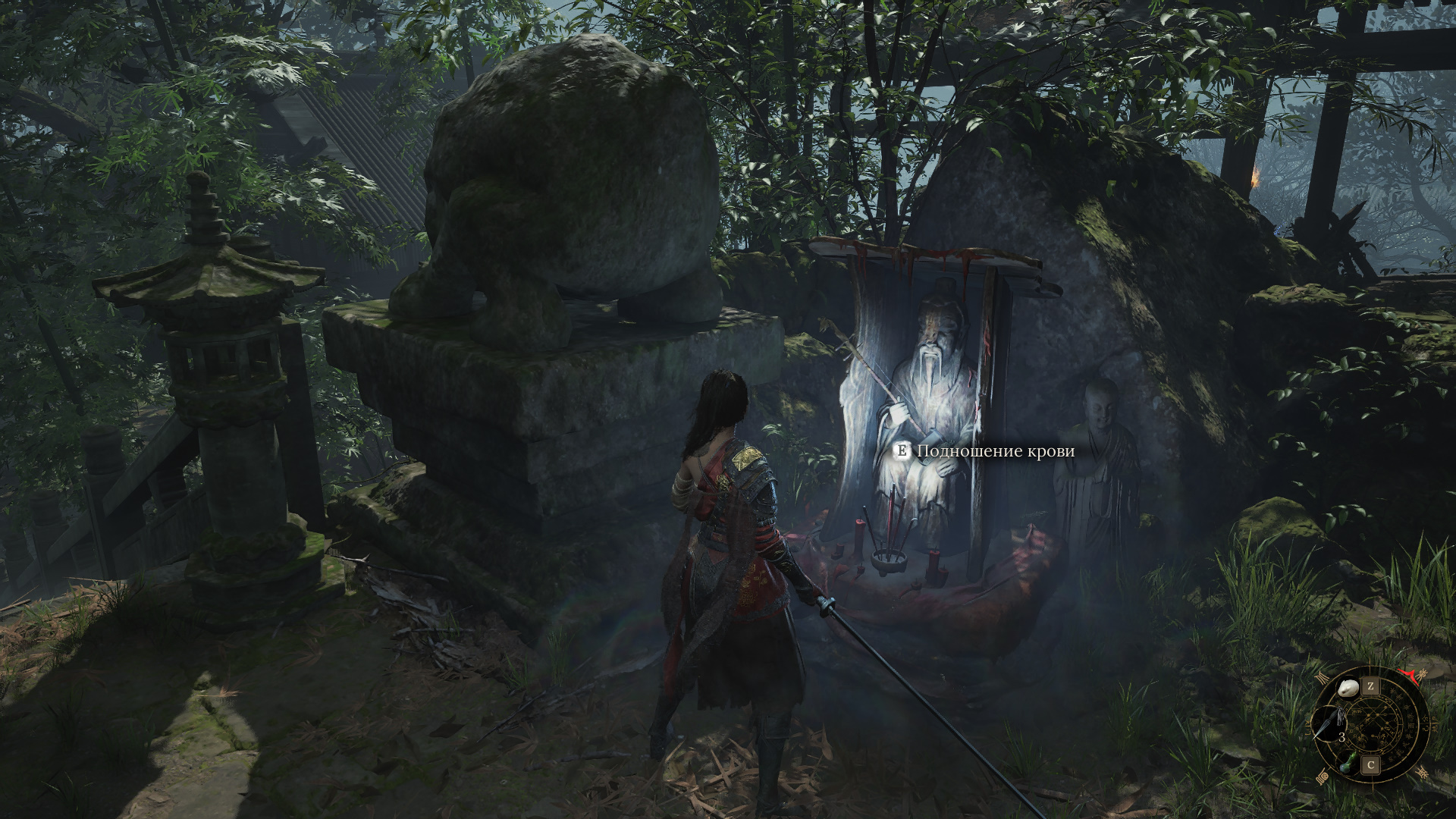 Продолжите движение и окажетесь на территории храма. Соберите припасы, победите врагов. Покинуть локацию можно через проем справа или левый дальний угол. В левом дальнем углу есть склон, по которому можно спуститься ниже. Двигайтесь туда, увидите впереди беседку, а слева от нее — шкатулку. Внутри беседки появится Демон. Это заскриптованное появление Внутреннего Демона. Победив его, вы получите кровь племени Бо и теневую каменную иглу на «Ловкость». Достаньте из шкатулки около беседки кулон бисе (уменьшает количество потерянной Красной ртути в случае гибели).