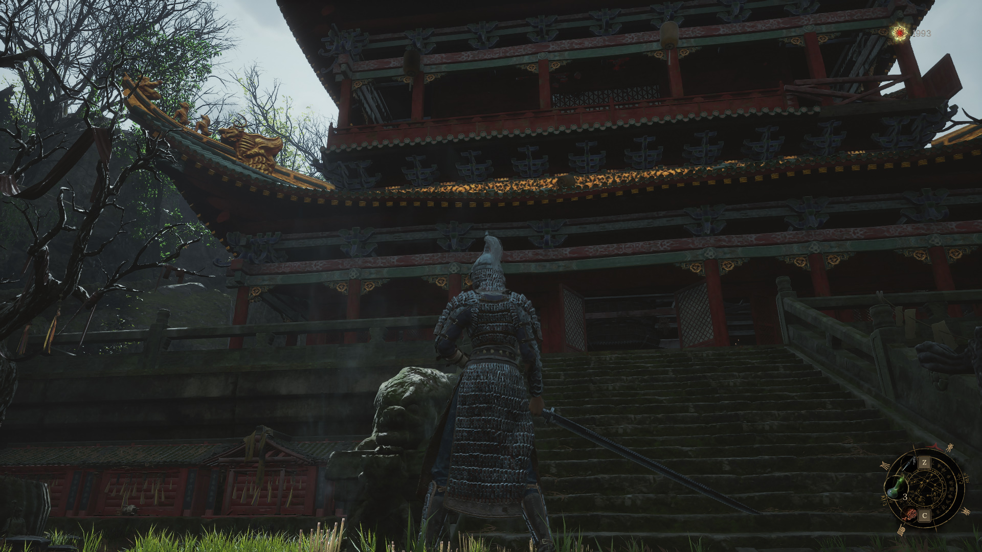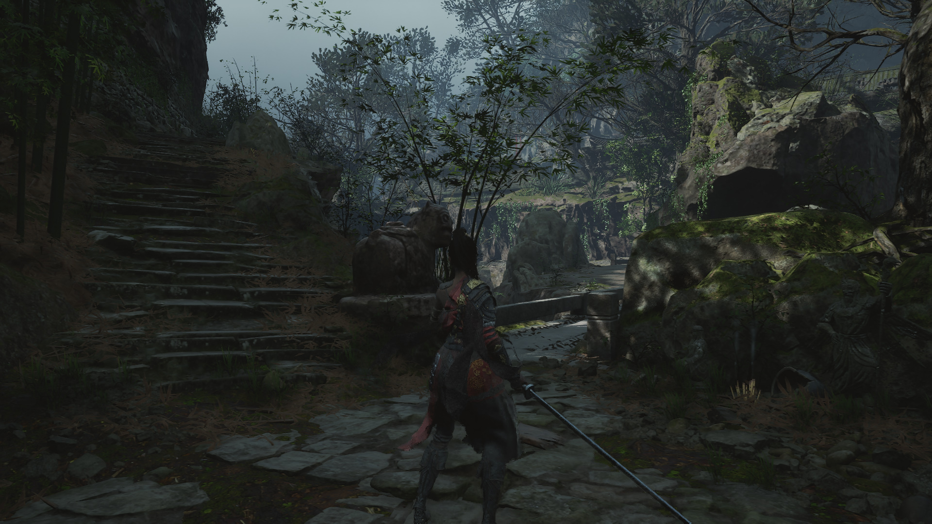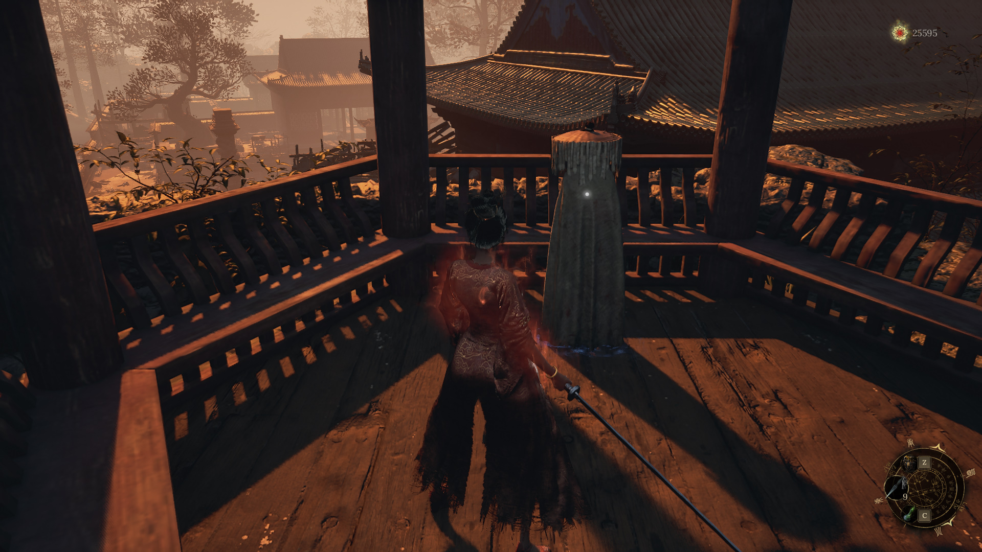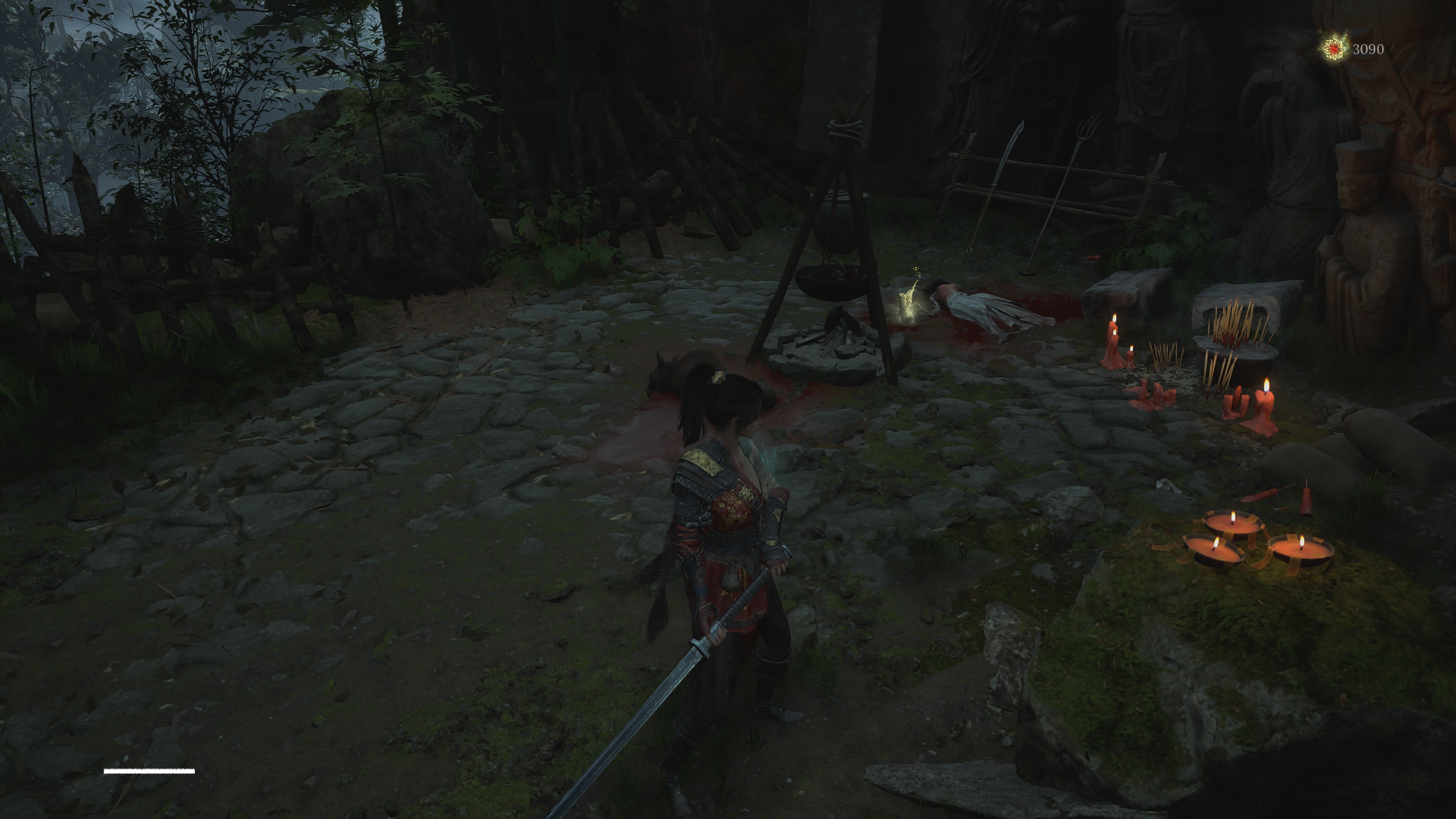 Продолжите движение и окажетесь на территории храма. Соберите припасы, победите врагов. Покинуть локацию можно через проем справа или левый дальний угол. В левом дальнем углу есть склон, по которому можно спуститься ниже. Двигайтесь туда, увидите впереди беседку, а слева от нее — шкатулку. Внутри беседки появится Демон. Это заскриптованное появление Внутреннего Демона. Победив его, вы получите кровь племени Бо и теневую каменную иглу на «Ловкость». Достаньте из шкатулки около беседки кулон бисе (уменьшает количество потерянной Красной ртути в случае гибели).