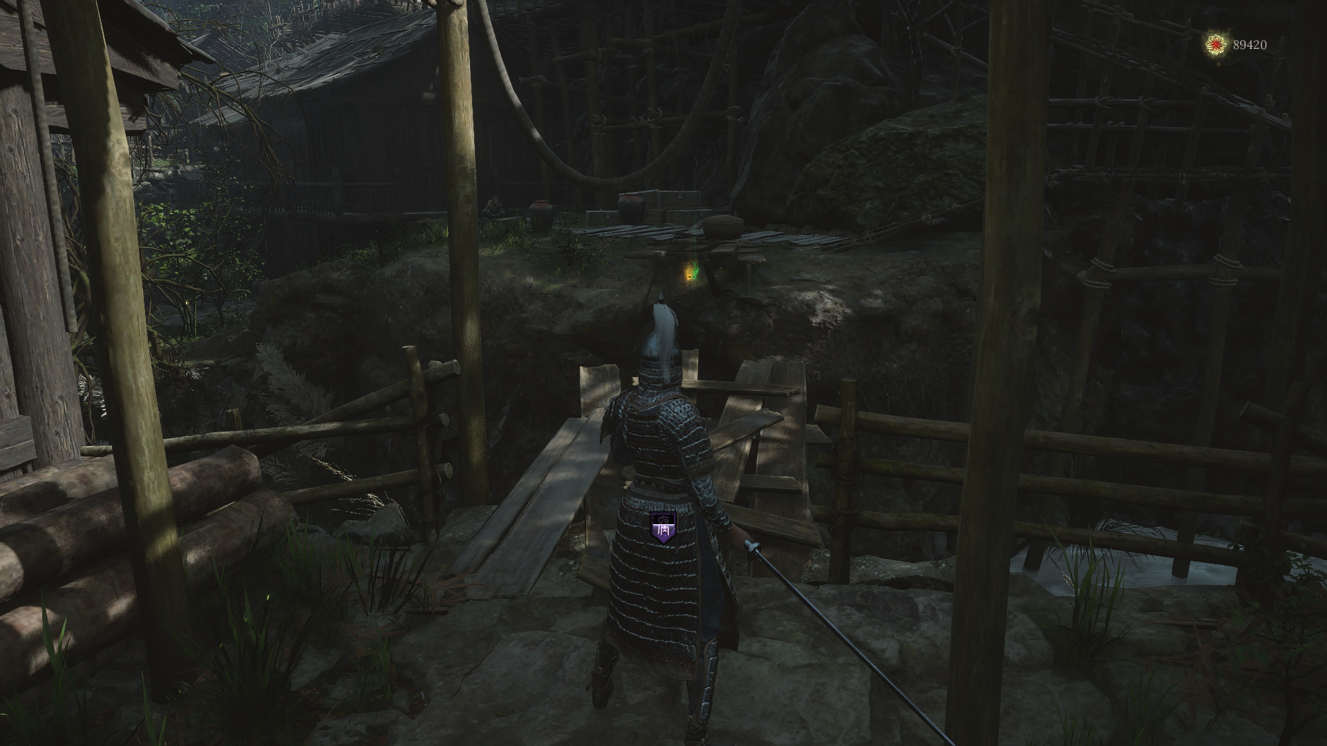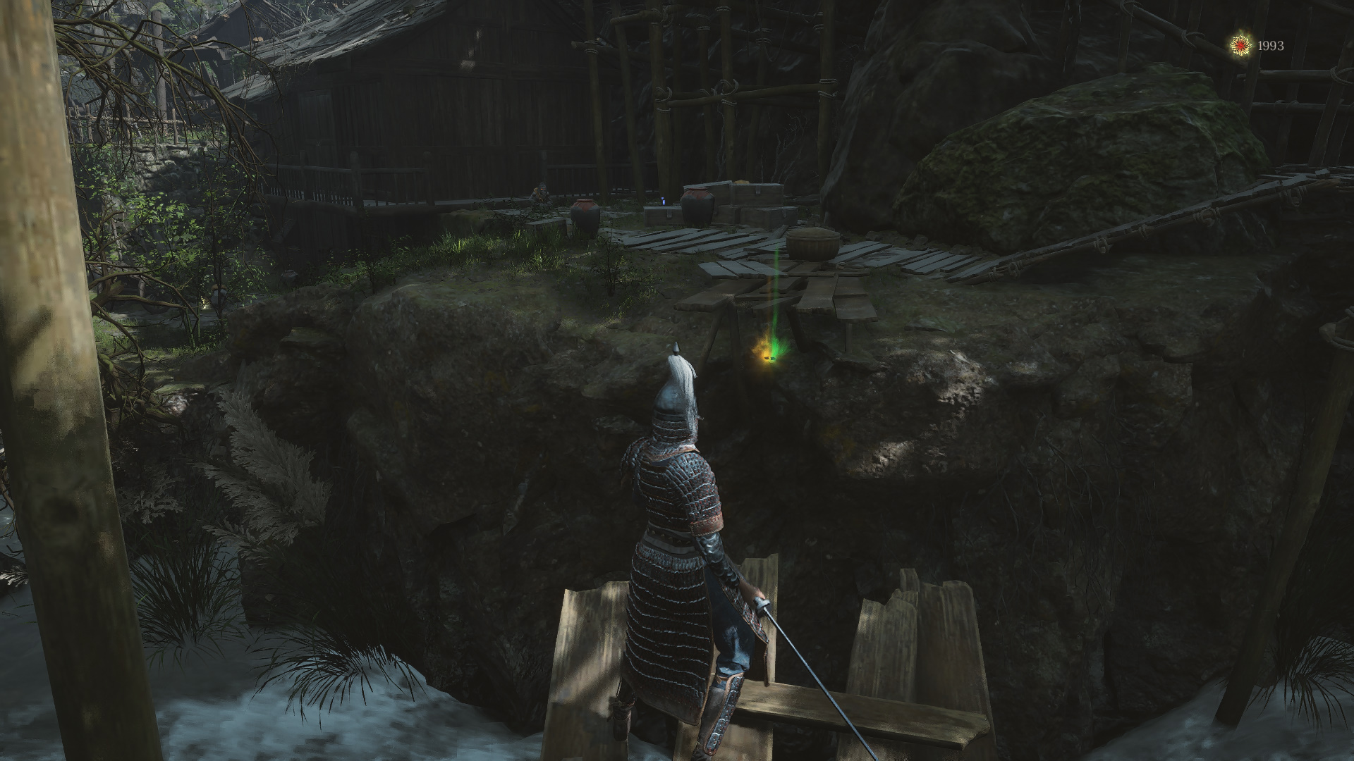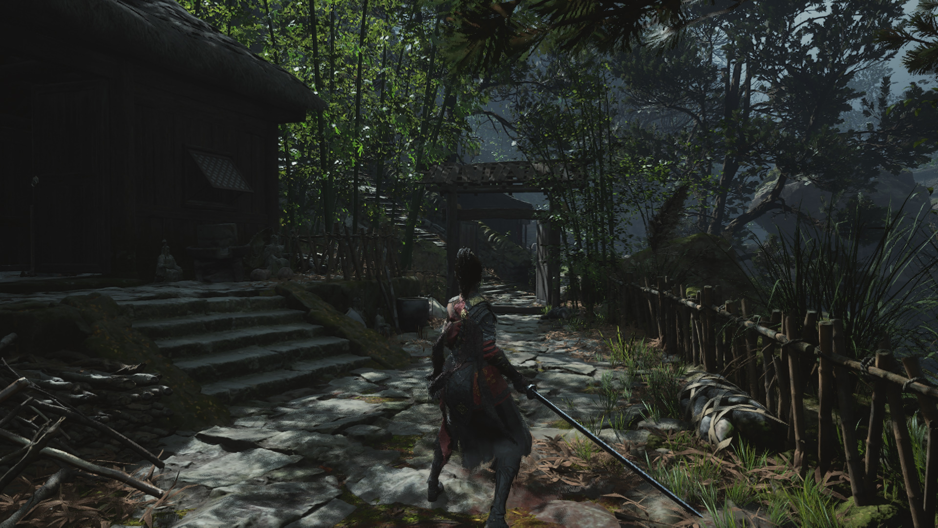 Обыщите эту часть деревни. Здесь много врагов, вверху есть запертые с другой стороны ворота. Внизу можно найти новое оружие — парные клинки дисбаланса. Идите понизу вперед и сверните влево, чтобы обнаружить Бамбуковый дворик: