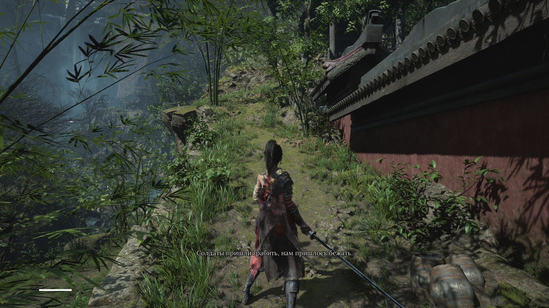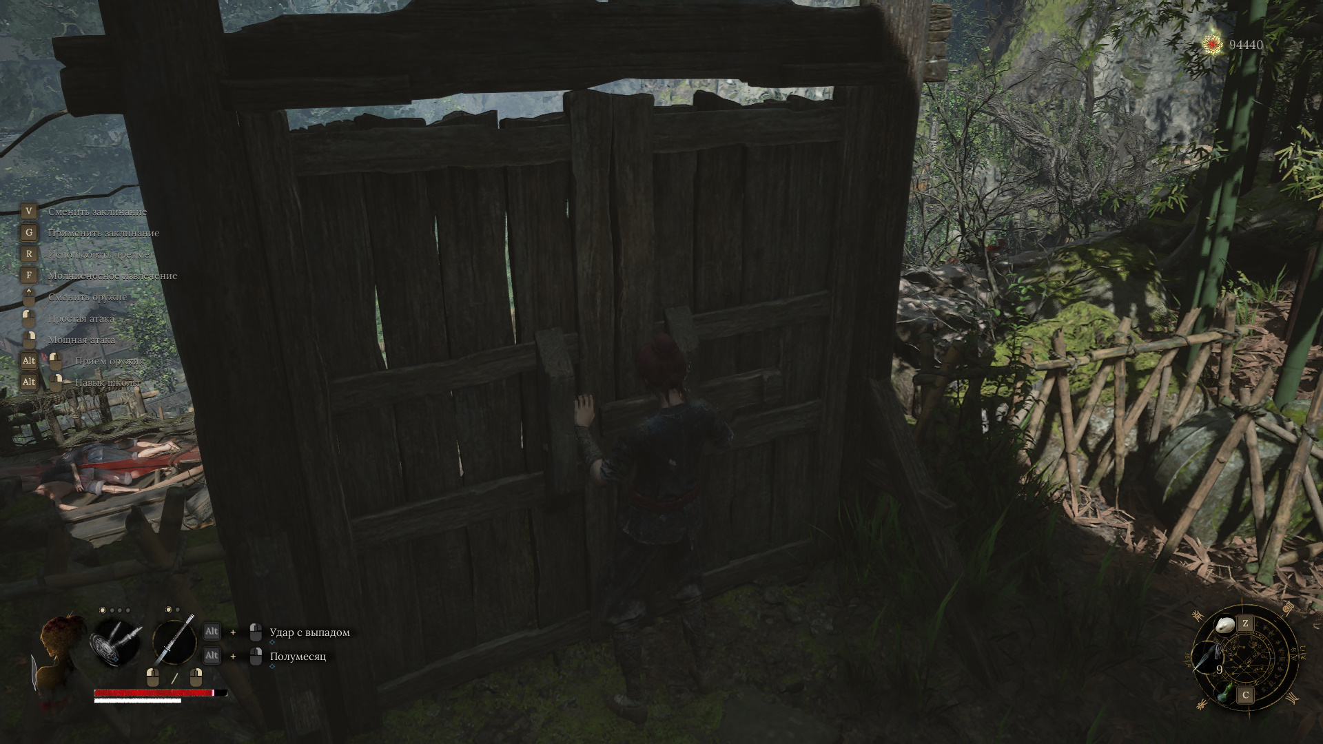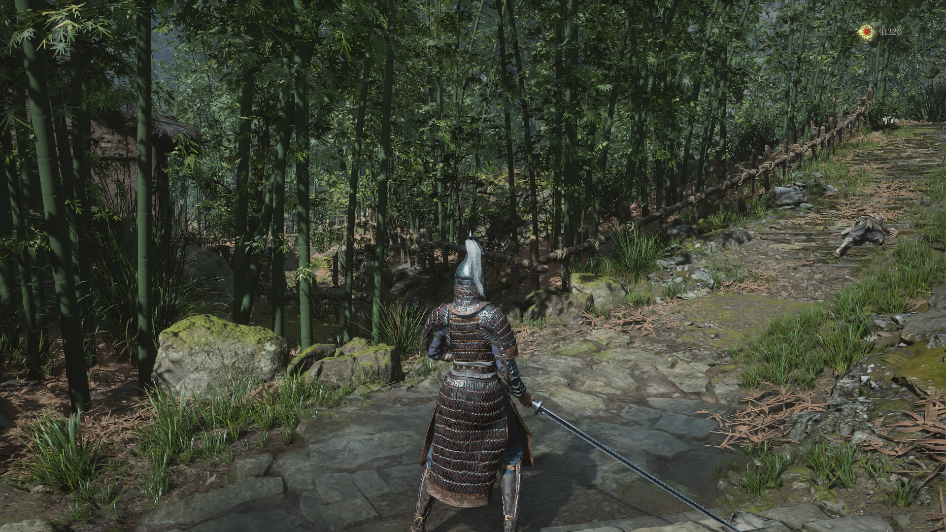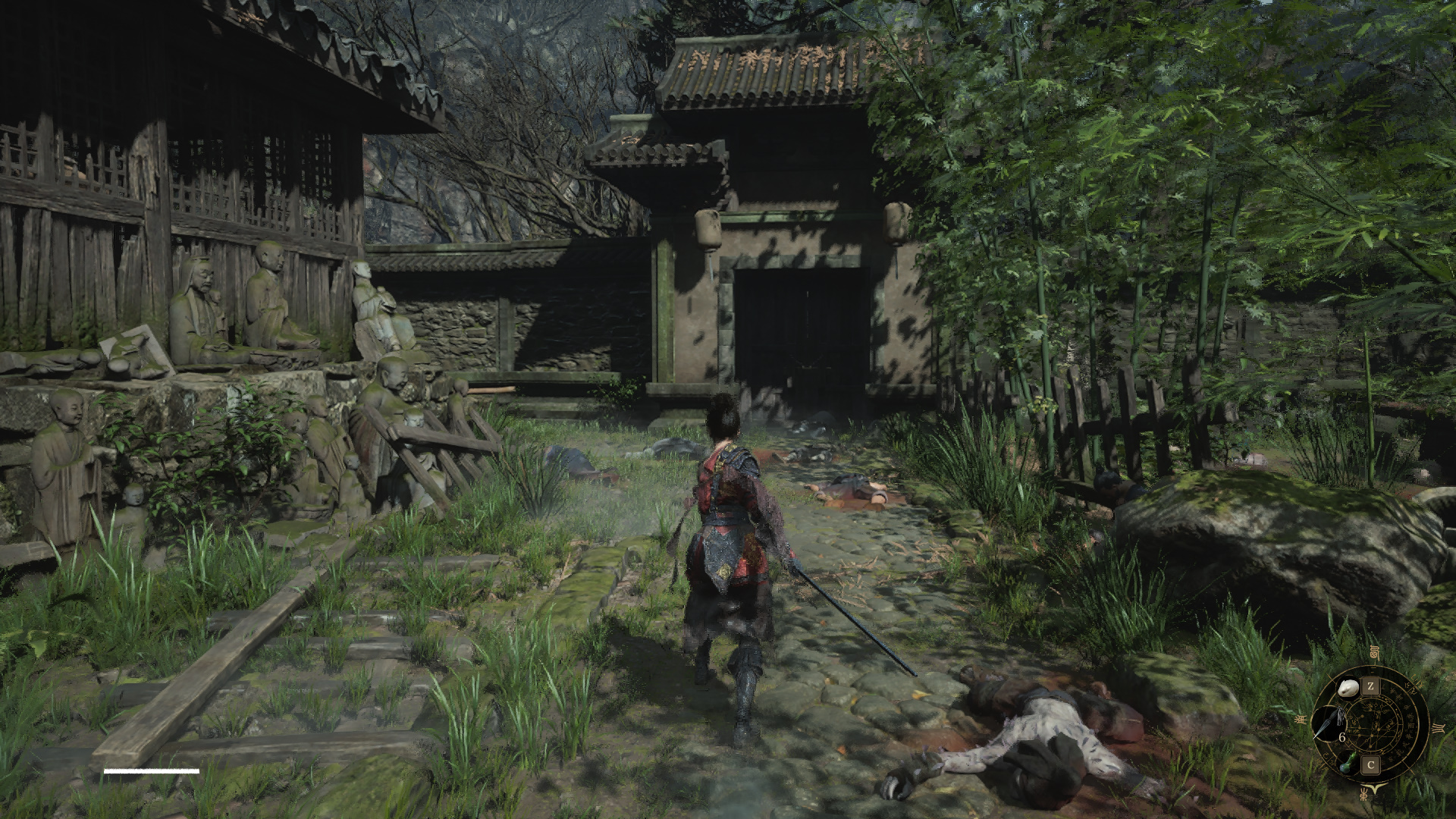 Обыщите эту часть деревни. Здесь много врагов, вверху есть запертые с другой стороны ворота. Внизу можно найти новое оружие — парные клинки дисбаланса. Идите понизу вперед и сверните влево, чтобы обнаружить Бамбуковый дворик: